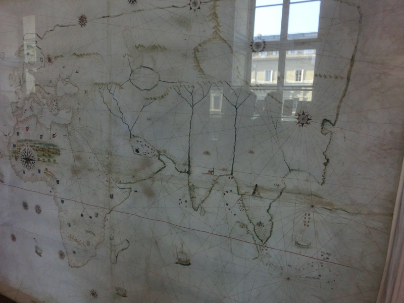 このあとも順に進むと、コインや調度品など数多くの展示がや天井画などがある。もはやこのあたりは通過するだけだが、これだけでも価値の高いものがたくさんあるのだろう。当時の世界地図は、いかにアジアが未知の場所だったかがわかるようだ。そしてようやく、最初に来たテラスまで戻ってきました。あとは螺旋階段をおり、出口へと向かう。ふう、お疲れさまでした。これで約2時間半、十分に堪能できました。