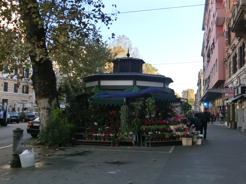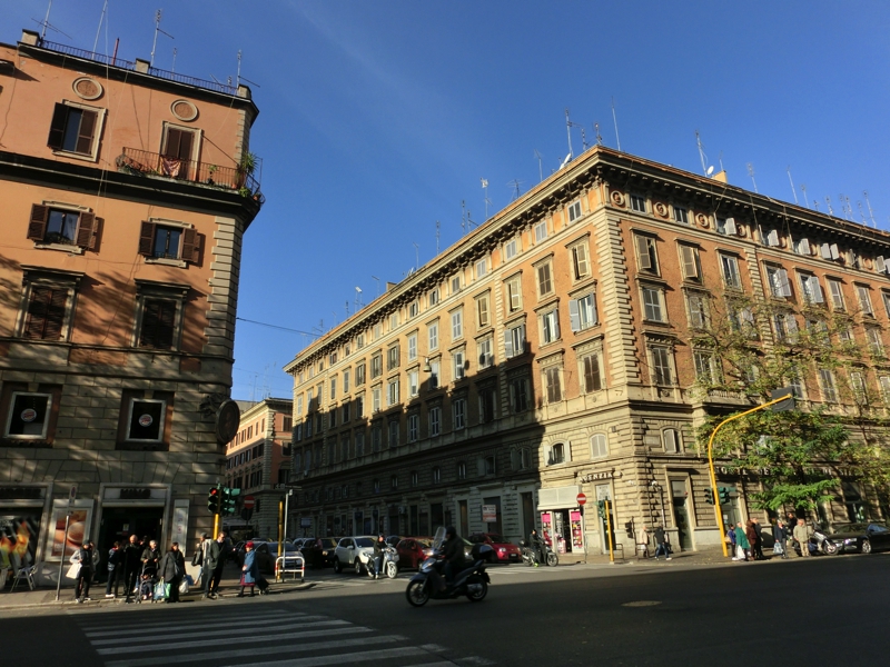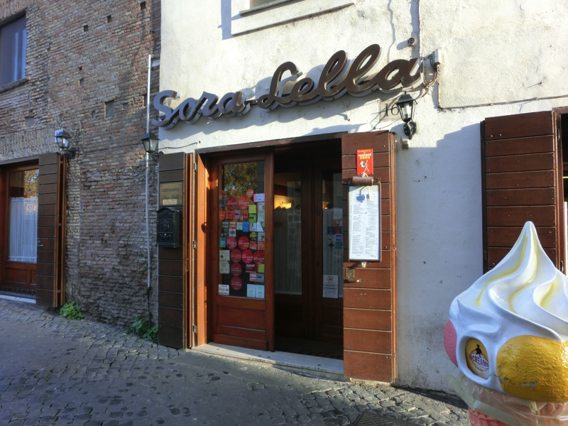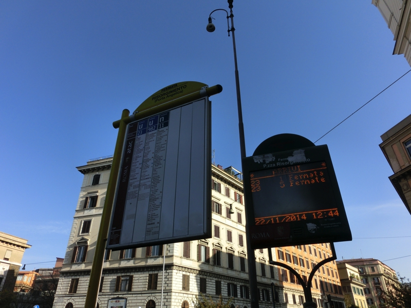 もう12時半、おなかがすいた。今日はテベレ川の中州にある、ティベリーナ島にあるレストランが目的地。この辺りから23番のバスで行けるようなので、バス停へと向かう。バチカンの城壁沿いにしばらく歩くと、バス停がありました。近くのキオスクで不機嫌なにいちゃんからチケットを買い(3E)、いざバスに乗車。バスは車内のモニタに次の停留所が表示されるようになっており、新しくてきれいだ。そうか、これならばバスの旅も悪くないね。10分ほどで目指すバス停に到着し、ここから橋を渡るとティベリーナ島に到着。初めて来るところだが、今日は土曜日だし地元の人たちが遊びにきているような場所のようだ。