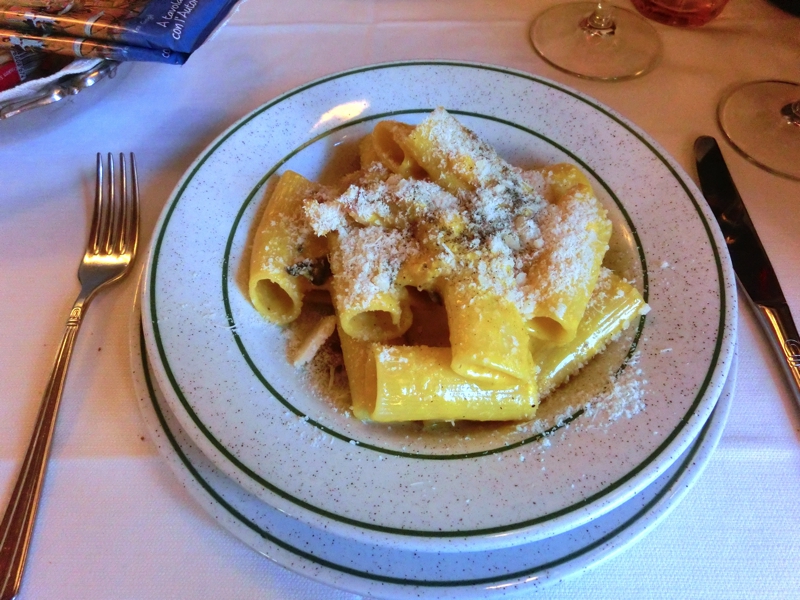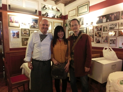 ここは先日行われた阪急でのイタリア展に来ていたシェフの店だ。是非本場のカルボナーラを食べたいとのことで、ちょっと不便な場所ではあるが来てみました。中に入ると、そのときのシェフはいなかったがひょっとしたらあとから来てくれるかも、とのことで、ポルペッティとカルボナーラ、ニョッキとトリッパを注文。まずはお店の赤ワインで乾杯だ。博物館で疲れた体にワインがしみわたる。まもなく出てきたのがポルペッティ、そしておまけのスップリ。ポルペッティは柔らかい肉団子のようなもので、少し酸味のあるトマトソースとの相性は抜群。とてもおいしいです。スップリは小さなライスコロッケで、アルデンテのお米ととろけるモツァレラチーズがいい感じ。どちらも赤ワインに合いますね。続いてきたのがカルボナーラとニョッキ。カルボナーラはリガトーニなので食べ応えがある。昨日のカルボナーラよりは濃厚な味わいで、これもまたおいしいです。ニョッキはこのもっちり感とトマトソース、ベーコンがとてもマッチしていて、こちらも食べ応えがある一皿だ。それぞれを味わっていると、阪急に来ていたシェフ、レナートが挨拶に来てくれました。先週は大阪で仕事して、今週はローマでこうして出会えるなんてなんだか不思議な気分ですね。