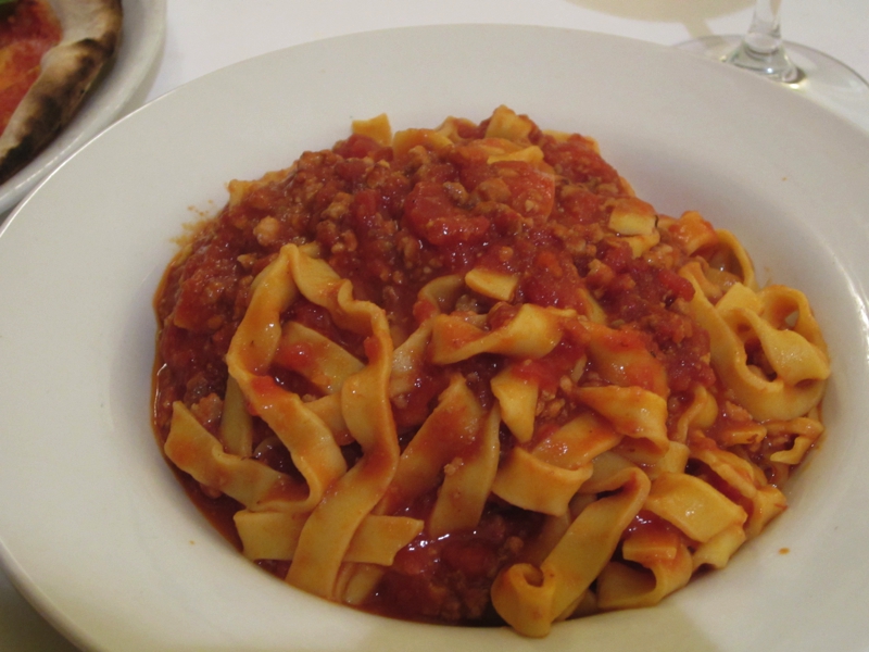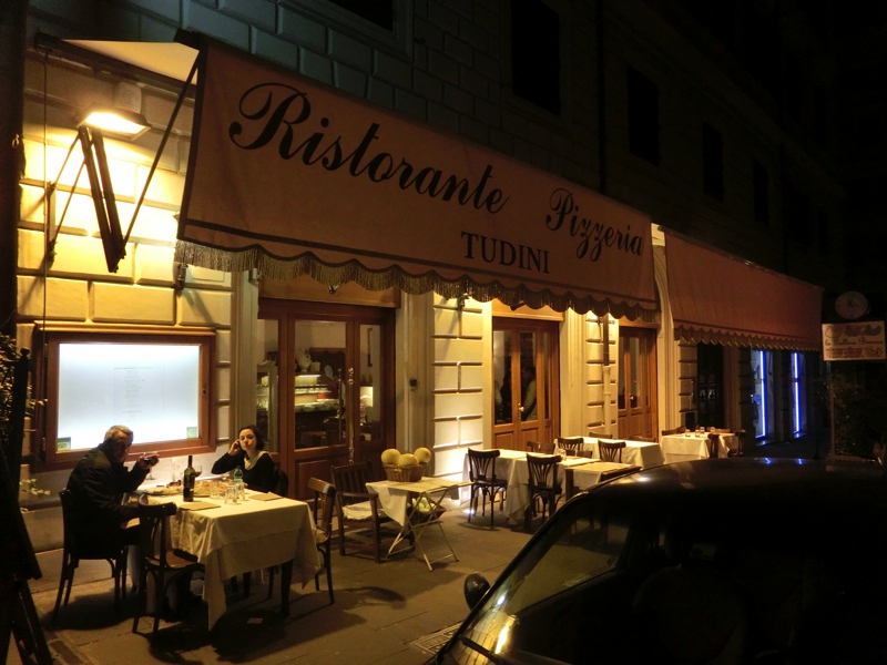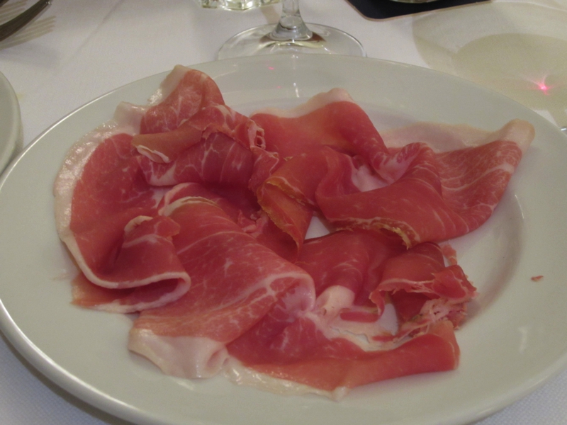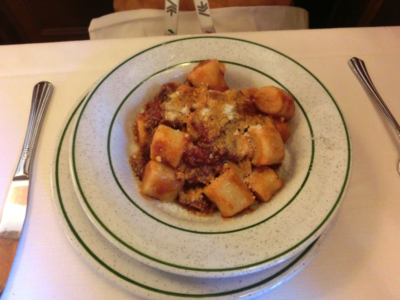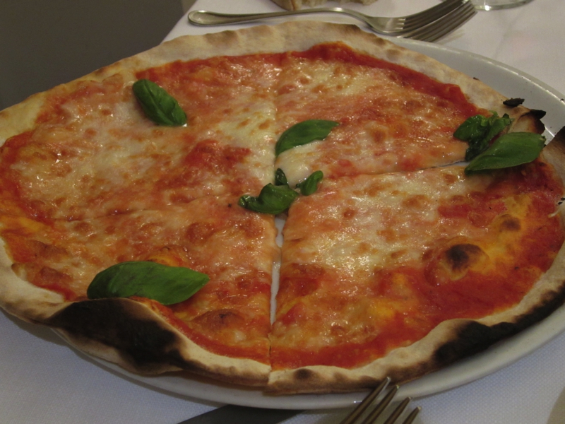 いたところにあったレストランに入りましょう。この時間ならばまだまだお客さんも入っている。昼をしっかり食べたのでここは軽めにということで、生ハムとボロネーゼ、マルゲリータを注文。ワインは1/4で十分かな。まずは生ハム、前菜にいいですね。赤ワインとともに、おいしくいただく。しばらくして、パスタとピザが登場。ボロネーゼは日本語メニューにはきしめんミートソースと書いていたが、要はフィットチーネ。ピザはチーズピザと書いてあったが、マルゲリータなのでトマトソースとバジルとモツァレラ。どちらもシンプルでおいしいです。こういうカジュアルなお店でさらっと食べられるところもイタリアのいいところかな。ごちそうさまでした(46E)。