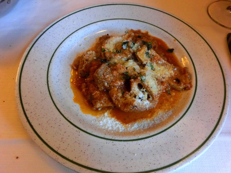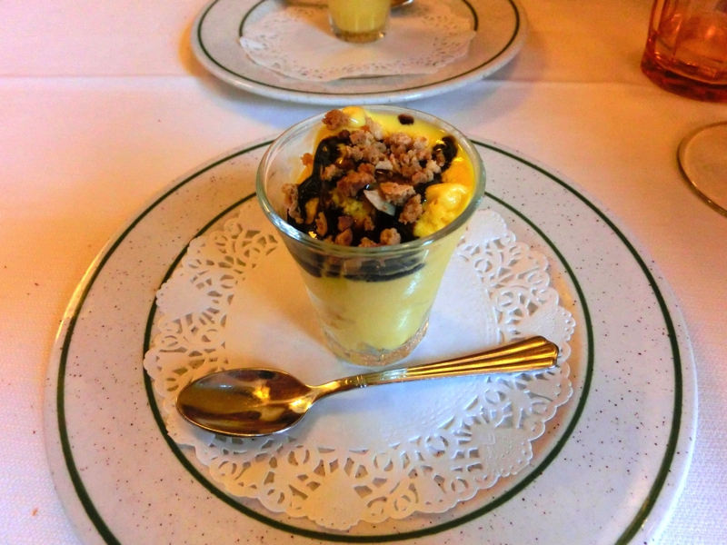 そしてメインはトリッパ、シェアなので半分にわけてくれているのだが、それでもたっぷりあるぞ。ハチノスやセンマイが主な部位だと思われるが、どれもトマトソースがしっかりとしみていてこれもまたおいしい。食べ応えのあるものばかりだったので、かなり満腹になってしまいました。そこでレナートからいただいたスイーツの差し入れ。ザバイオーネという洋酒の効いたカスタードクリームのようなもので、ちょうどいい感じの量。おいしくいただき最後はカフェで締め、ごちそうさまでした(70E)。その後はレナートと少し話したり、お土産のキットカットを渡したりと、楽しい時間を過ごす。