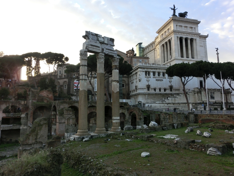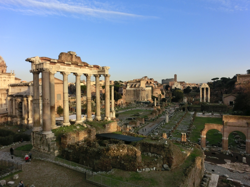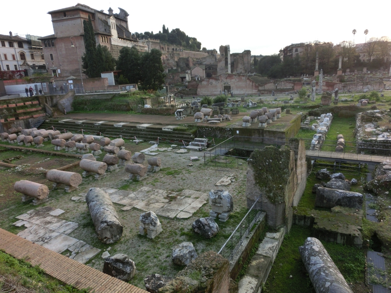 さて、満腹なので少し歩きましょうか。ティベリーナ島を出て、しばらく歩くとフォロロマーノが見えてきた。中に入ってみたいとも思ったが、今の時期は16:30までなので、ちょっと厳しいかな。坂道を上ると、フォロロマーノが見渡せる場所に来た。かつてここにはたくさんの石造りの建物があり、政治の中心であったという場所。さすがに古すぎて、ここを改修というのは難しいと思われるので今後もずっとこの状態なんだろうが、いろいろと想像を巡らせるのも楽しいものです。