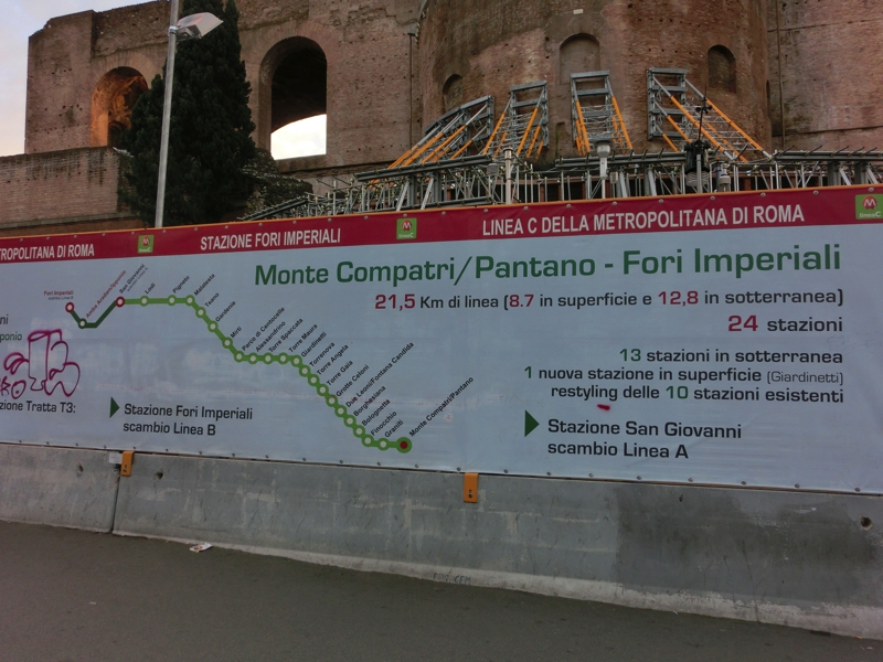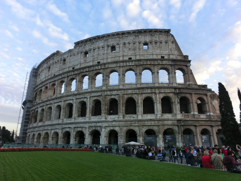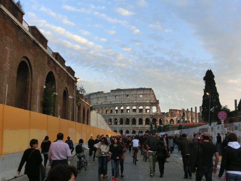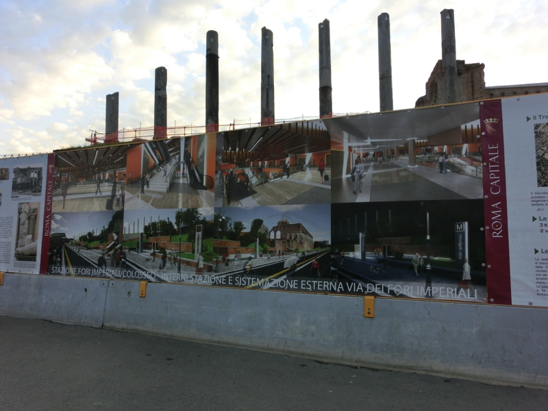 大通りに出ると目の前にコロッセオが見えるのだが、今日は土曜日ということもあってここは歩行者天国になっているのかな。たくさんの人が、古代都市の歴史を感じながらそぞろ歩きを楽しんでいました。それにしても、工事中のところが多い。城壁も全面が覆われているようで、看板を見たところこのあたりに新たに地下鉄路線ができるようだ。掘ったらいろんな遺跡が出てきそうだが、本当にできるのかなあ。一応2020年の完成予定で進んでいるようで、またその頃に見に来れたらいいですね。そのときは、フォロロマーノの中もゆったり散策しようかな。そしてコロッセオに到着。ここも改修が行われているようだ。何度見てもこの存在感は凄まじいな。すぐ目の前に地下鉄の駅があるので、テルミニ駅まで戻りましょう(3E)。