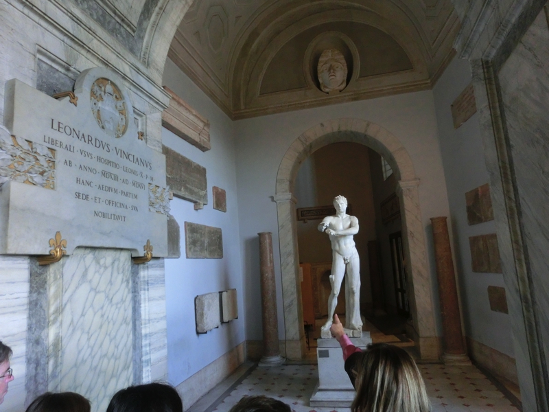 ここはピーニャの中庭といわれる場所で、真っ青なそらとこの緑が気持ちいい。ここで少しリフレッシュしたところで、先へ進みましょう。回廊の中に入ると、そこはキアラモンティ美術館。ここは多数の石像が展示されている。ここはざっとみる程度にとどめ、階段を上がる。