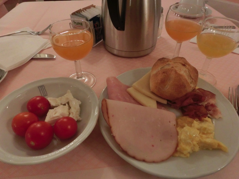 それにしても隣でのいつでもいくらでも寝られる体質が本当にうらやましい限り。シャワーを浴びて準備して、8時過ぎに朝ごはんへと向かう。一階の朝ごはん場所はすでに多くの宿泊客がいて、ちょうど空いていた奥の席を取る。バイキング形式なので、いろいろといただきましょう。やっぱり基本のハムとチーズ、そしてトマトがあるのがうれしい。パンもイタリアにしてはおいしかったし、このくらいなら十分ですね。食後のカフェラテは機械で入れるもので、まあこんなものかな。ごちそうさまでした。部屋に戻って準備をして、9時過ぎに出発だ。