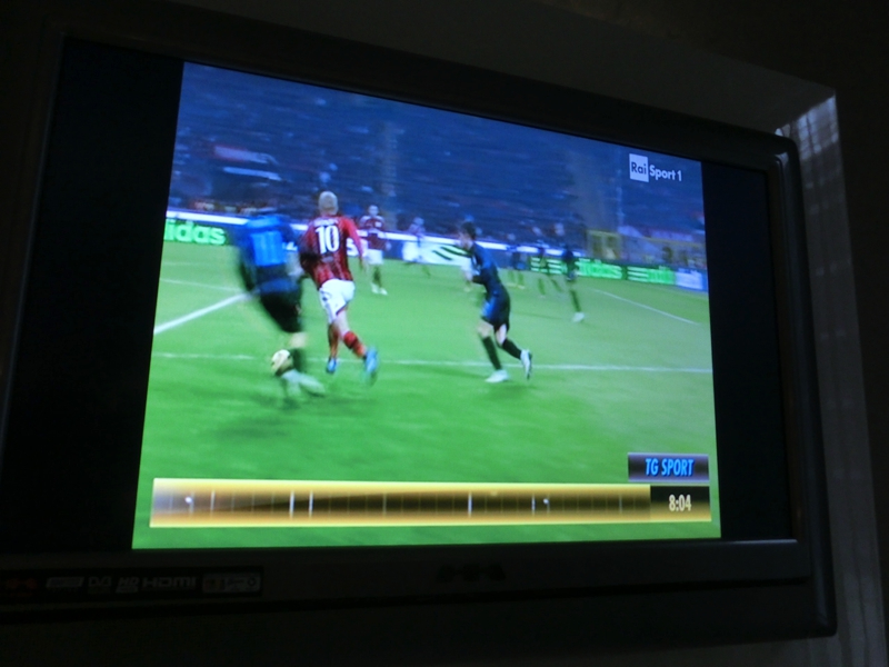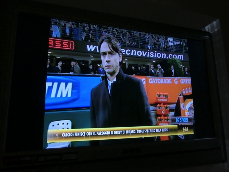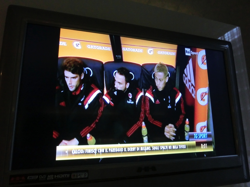 今日も4時起床。だんだんとパターン化されてきたな。昨日ダービーで疲れていても、まだ時差ぼけは継続中。日記を書いて過ごした後シャワーに入り、8時頃でてくるとテレビではちょうどミラノダービーを解説していた。ベンチスタートの本田がきちんと映し出されているのは「今季初めて先発を外れた本田、日本代表の疲労を考慮したようです」くらいの説明が入ったのかな。インテルのゴールシーンには長友からのパスも映っているし、途中出場の本田の放つ惜しいシュートシーンもあった。昨日の席からはよくわからなかったことも、テレビで見返すとよくわかる。何れにしても、ミラノダービー初の日本人対決は、それぞれの力を出した一戦になったようだ。特に本田には得点が生まれなかったことが残念だが、この後の活躍にも期待しましょう。