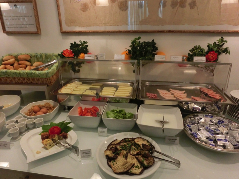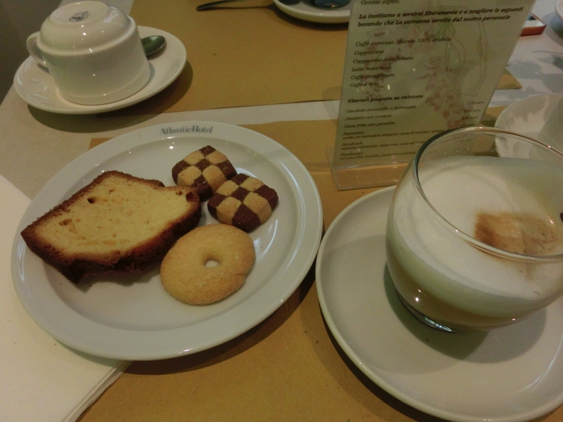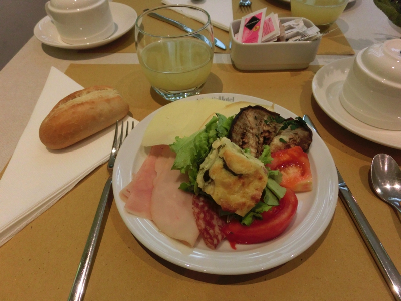 さて、では朝ごはんへと行きますか。地下にある朝ごはん場所は明るく、ハムやチーズ、トマトやモツァレラなどが並んでいる。何せ昨日はろくな食生活ではなかったので、きっちりと栄養補給をしましょう。野菜やハムなど、いつも以上においしく感じるのは空腹のせいか。チキンスープがあるのは珍しいのでしっかりといただき、ヨーグルトもいただき、食後にはラッテマキアートもいただきましょう。ようやく取れた栄養に、体も目覚めてきたようだ。