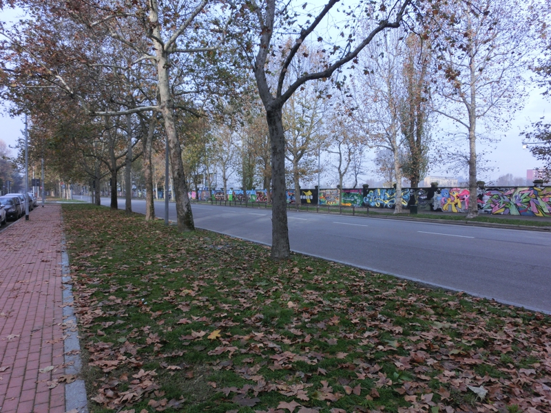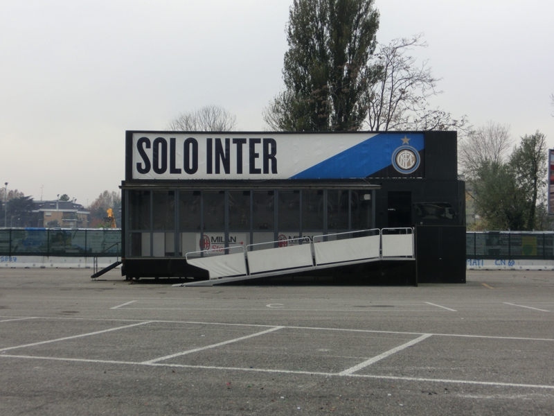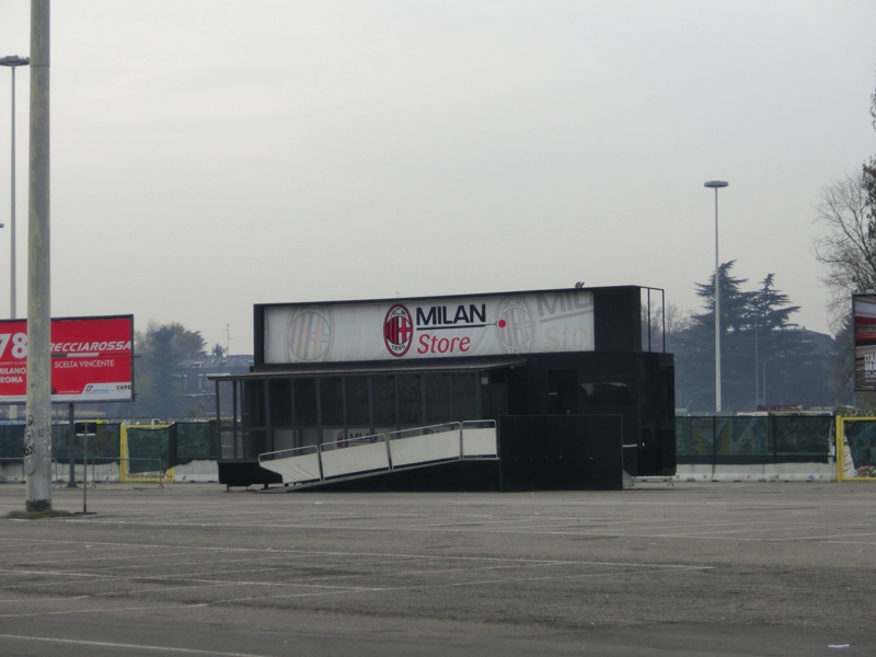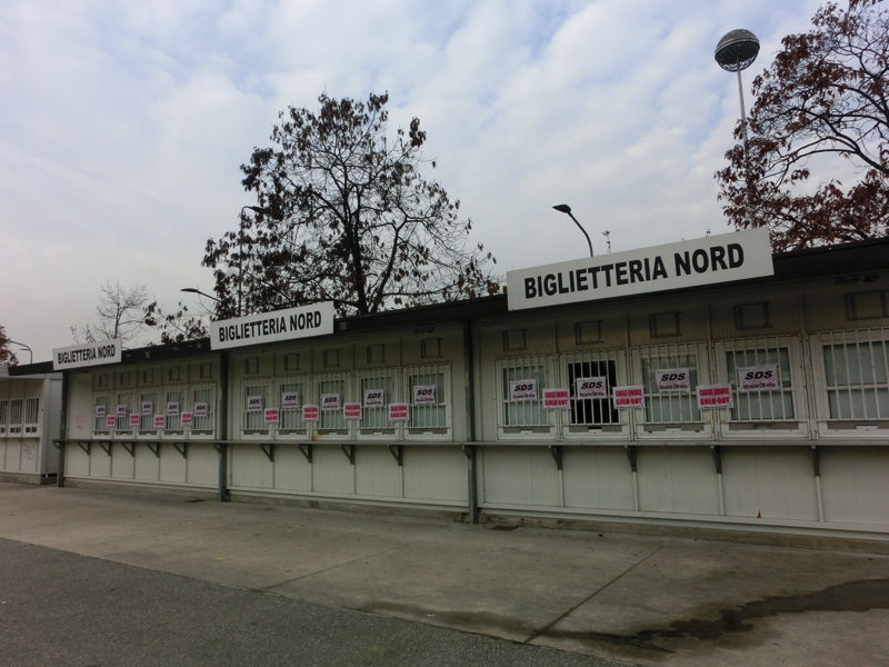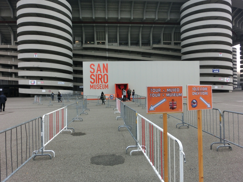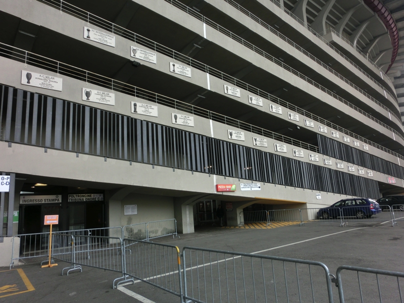 そろそろ10時、出かけますか。空気がひんやりしていて気持ちがいい。現金がなくなってきたのでキャッシング(210E)。ミラノ中央駅前にあるビルには、よく見ると来年行われるEXPOの表示がされていて、窓には各国の国旗が並んでいる。どんな万博になるんだろうな。地下におり、メトロへと乗り込む(3E)。Cadorna駅で乗り換えるが、ここが昨日は大混雑だったんだね。Lotto駅に到着し、地上へと出る。昨日は人ごみの中を流れにのって歩くしかなかったが、今日は人通りもほとんどなく、ゆったり歩ける。そうか、こんな一本道をずっと歩いていたんだね。道の反対側の壁にはずっと様々な絵が描かれている。アニメのキャラクターのようなものもあればサッカー選手の似顔絵もあり、こういうのはいつどんなきっかけで誰が書いたんだろうね。正直、似顔絵はあまり似ていないが・・・と、いつの間にやらそろそろスタジアム。巨大な建物が目の前に見えてきたぞ。昨日はこの辺りから道はゴミだらけだったのだが、ほとんどなくなっている。夜中の間にきれいにしたんだね。それにしてもどうしてあれだけゴミが散らかるのだろうと思ったが・・スタジアムエリアに入ってきた。昨日あれだけあったグッズや軽食の屋台はことごとく撤収されていて、ミランのオフィシャルショップだけがぽつんとたっている。オフィシャルといいながら、プレハブの小さな店なのだが今日はやっていないようだ。ゲートのところには、スタジアムツアーやミュージアムの表示が出ている。これは親切ですね。表示に従って8番ゲートまで行くと、何人かちょうど中に入っていったのが見えた。では早速入りますか。
