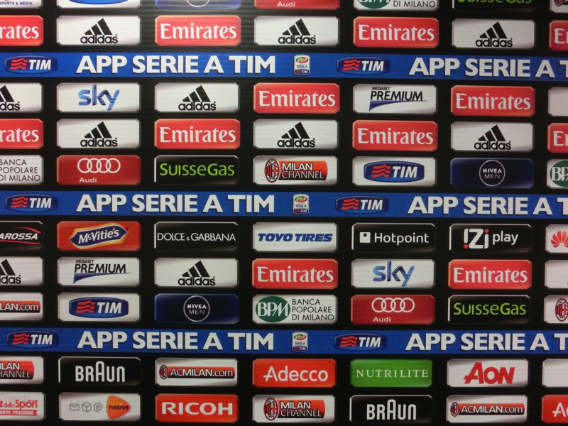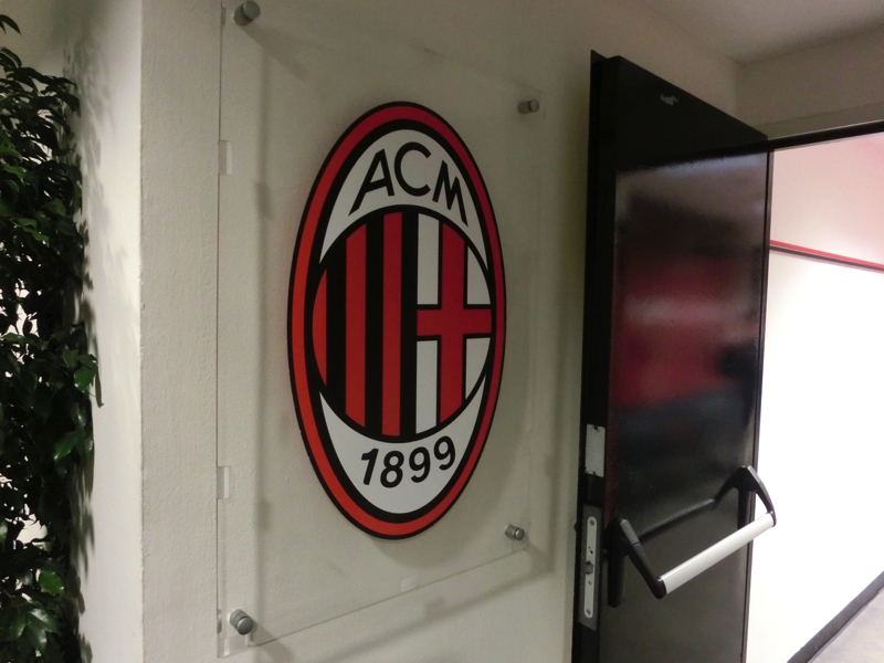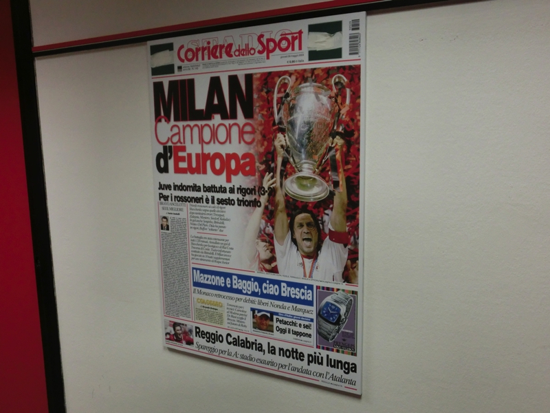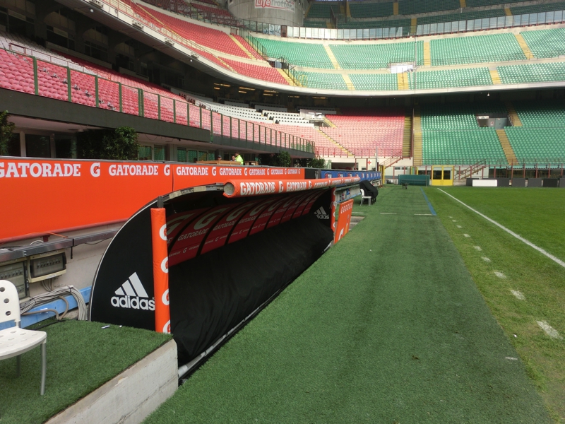 ゲートのところにはブースがあり、ここでチケットを購入(34E)。中に入ると、さらにスタジアムが大きく感じる。シャルケと収容人数は同じくらいなのだが、あとから増設された部分、つまり昨日上ったスロープの部分が張り出しているので、さらに大きな造りになっているようだ。スタジアム内へと入りますか。まずは選手の通るミックスゾーン。ここでインタビューがされるわけだ。ミランがホームの試合があったばかりなので、スポンサーはミラン仕様になっているらしい。ここで選手気分で写真を撮り、奥へと進む。このスタジアムツアーは特にガイドがあるわけではなく、順路に従って各自のペースで見ていくパターン。