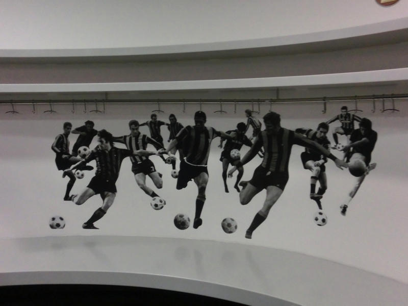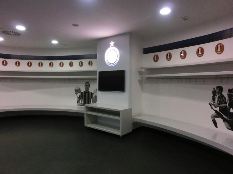 ミランのときは気づかなかったが、通路にはバスやトイレ、マッサージルームなどがあるようだ。部屋に入ると、こちらはシンプルに壁際の長い椅子とハンガー。特に選手ごとに分かれているのではないようだ。ここは真ん中に大きなモニタ一つあり、壁には往年の名選手が書かれている。こうしたところにも、ミランとインテルのチームカラーが出ているようだ。奥のバスルームも見えるのだが、湯船らしきものは意外と狭そうだ。ここに昨日はインテルの選手がいたんだね。もちろん長友も。