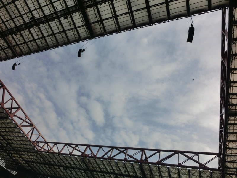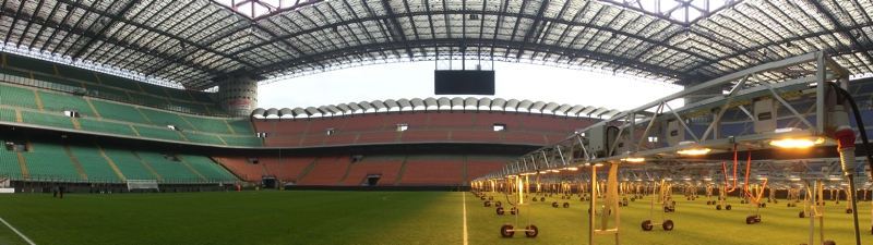 この部屋を出ると、次はいよいよピッチへ。狭い階段から通路を抜けると、芝生の場所までやってきました。当然中には入れないが、ここから見上げる観客席は迫力満点。ここに昨日は約7万人の観客がいたわけで、ピッチにいるとまさにすごい歓声なんだろうな。芝生の半分には、オレンジっぽい光がたくさんの機械で当てられているのは芝生の成長を促すため。ここサンシーロは3階席の増築や屋根をつけたせいで芝生にはほとんど光が届かず、何もしないとあまり成長しないようです。それは困るなあ、ということでこうして対応をしているわけですね。ここから昨日いたゴール裏3階席を見上げる。実に遠い。でも全体はよく見えたから楽しかったです。メインスタンドに上ってみる。この一階席あたりの少し上の方が、ピッチ全体も選手の表情も、どちらもよく見えそうだ。ここならベンチワークも見えるので、昨日の本田の交代ももっとリアルに分かったのかもね。次回機会があれば、是非このあたりで見たいものです。チケットの値段が全然違うけど・・もう少し上に上がると、少しクッションの効いたいい椅子のエリアがあり、さらに上にはVIPルーム。昨日はどんな人がいたんだろうね。ざっと見学はこんなところかな。