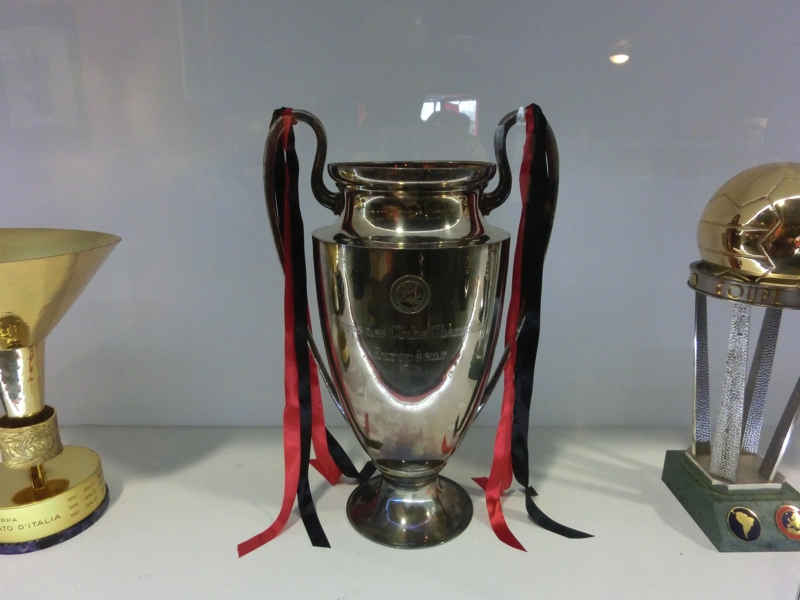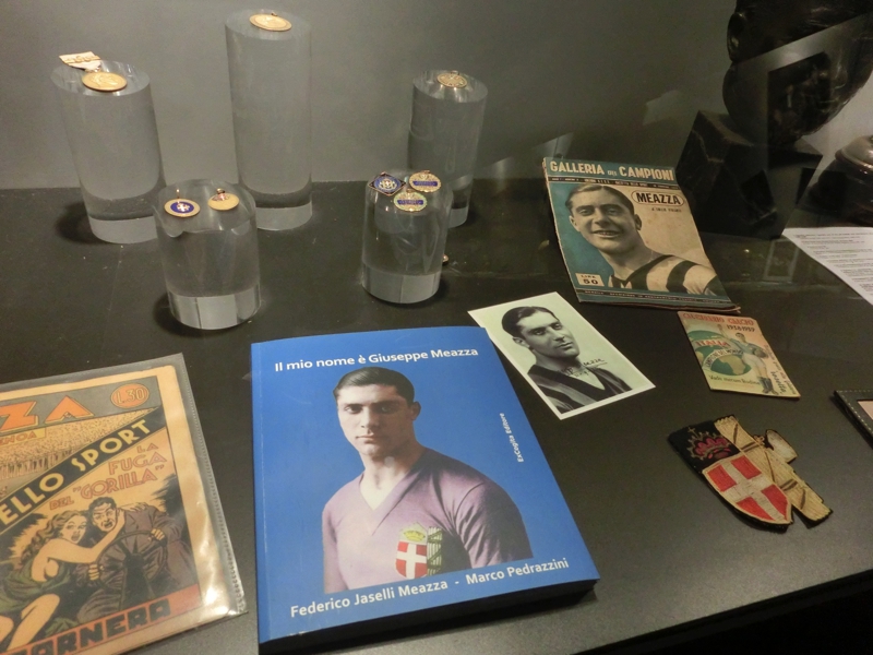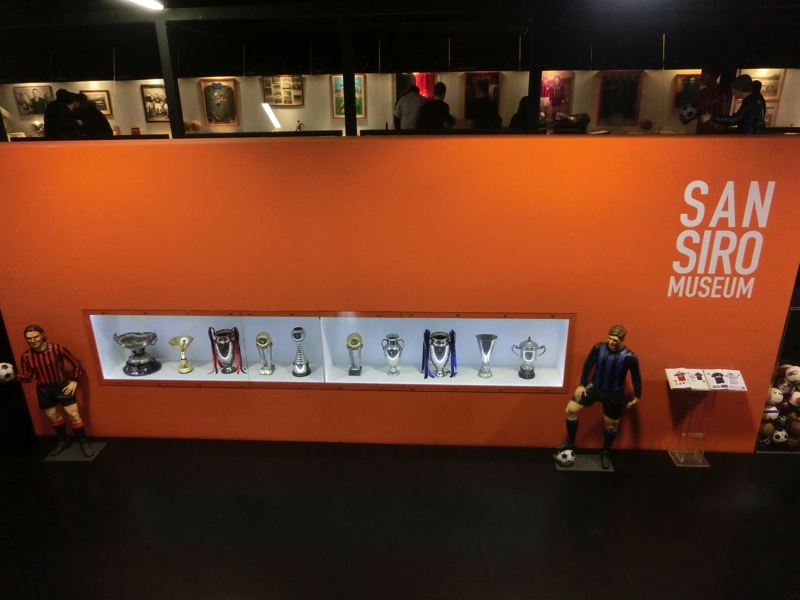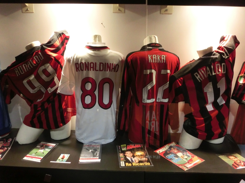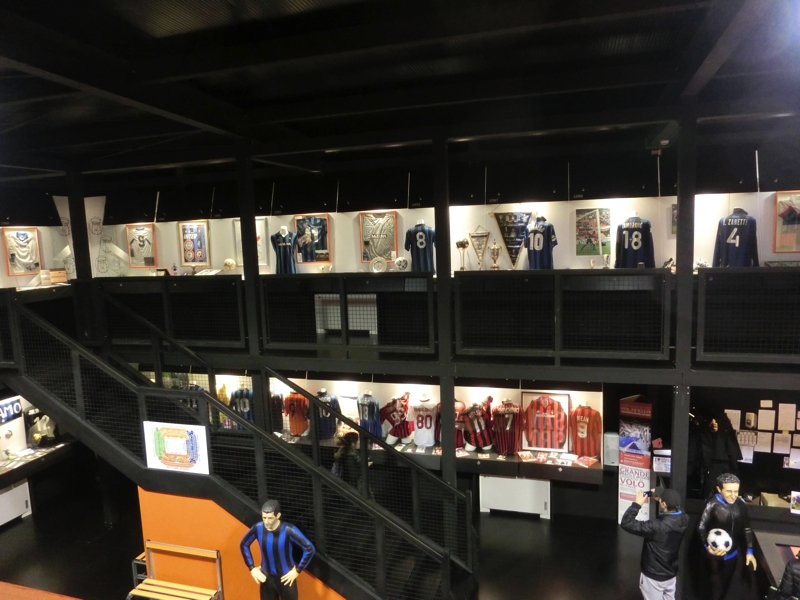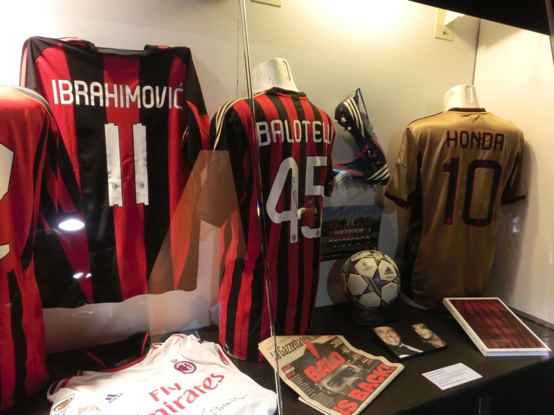 ユニフォームやカレンダー、キーホルダーなどミランインテルそれぞれのグッズが売っている。小さなクマのぬいぐるみがミランのユニフォームを着ていたのでゲット(12E)。残念ながらインテルのはなかったが、後でドォウモ近くのショップにも行ってみるのでそこにあればいいな。続いてはミュージアム。こんなに歴史もステータスもある両クラブなのに、プレハブ小屋なのはなぜ?でも展示物には見応えがあり、しっかり見るにはこのくらいの規模が丁度かも。両クラブの創設から名選手の説明、ユニフォームの展示などあり、数多くの名選手の中に本田も長友もユニフォームが飾られているのが誇らしい。古い時代は分からないが、ミランにはインザーギやマルディーニ、ロナウジーニョなど、