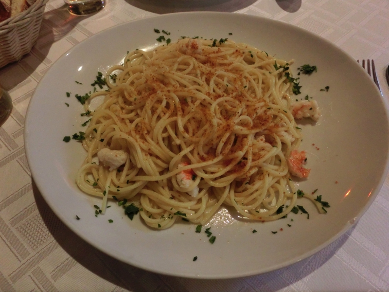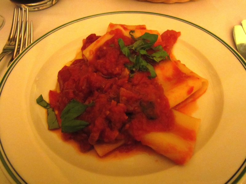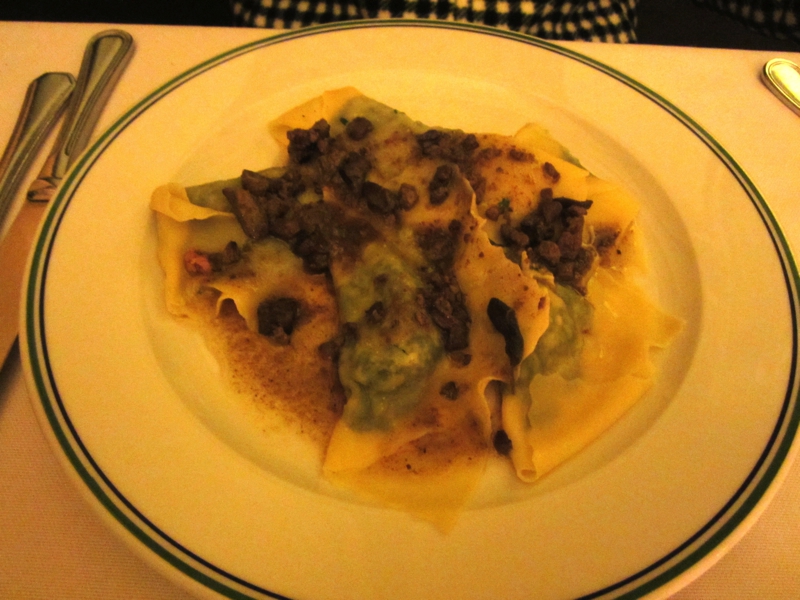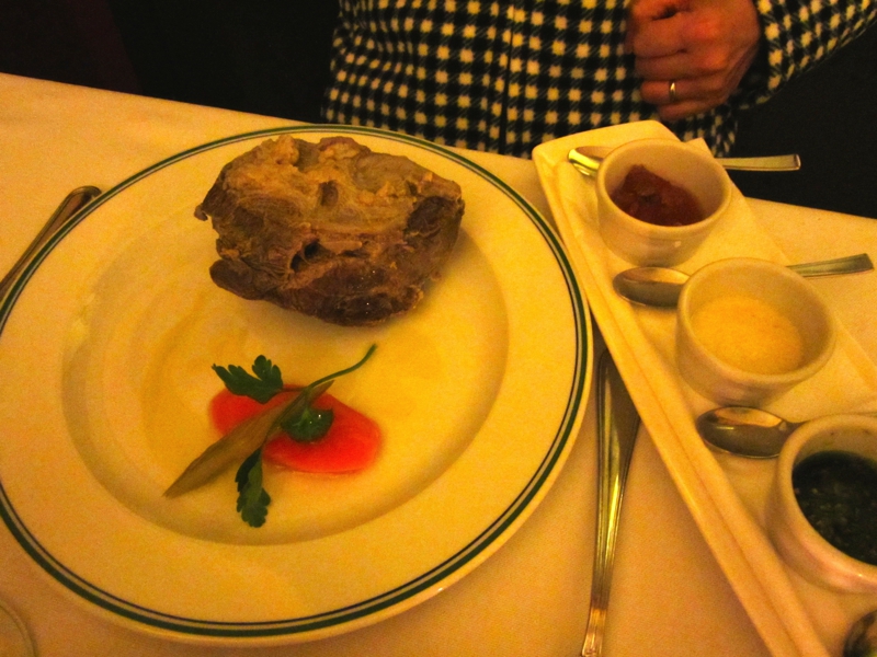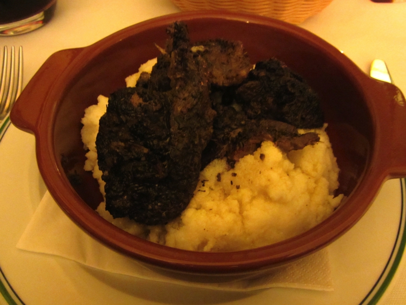 さて、何をいただきましょうか。ちょっと体も冷えたので赤ワインを頼み、パスタはパッケリのトマトソースのと野菜入りのトルテッリをいただく。どちらも味がしっかりしていて、赤ワインにもいい感じ。メインは肉料理をそれぞれ頼み、一つはAnatra al ginepro。カモ料理なのだが、大量のポレンタとともに出てきました。カモそのものはおいしいのだが、gineproというのがなにやら癖のある香辛料で、あまり得意ではないかも・・・もう一つはBollitoという牛肉の煮込み。肉自体はシンプルなので、マスタードやジェノベーゼなどのソースをつけて食べる。これは食べ応えもあっていい感じ。