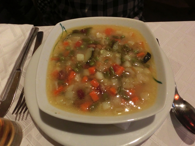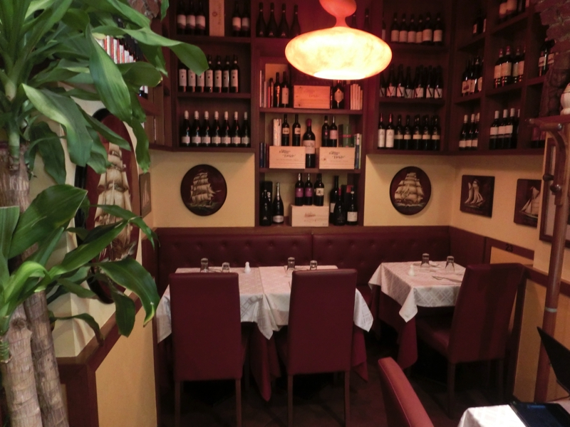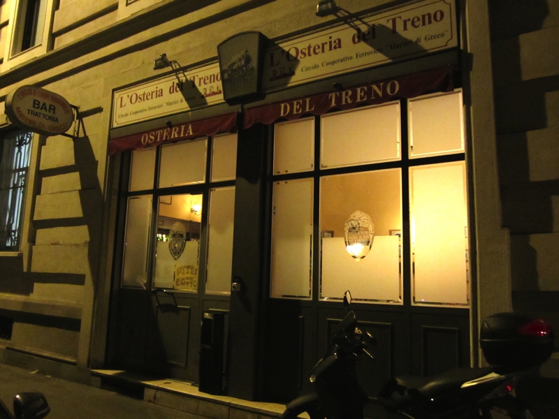 いったん部屋に戻ってしかも外がこれだけ暗くなると、できれば近場ですませたい。あまり情報のない中、少し歩いたところにあるOsteria Del Trenoというお店に行くことに。駅前なのにあまり街灯のない中を歩き、数分程度で到着。それなりにお客さんは入っているようだが、まだまだこれからという感じ。でも中は暖かく、いい感じのお店だな。ここは名前の通り、列車をイメージしているようで店内には鉄道の写真などが飾られている。