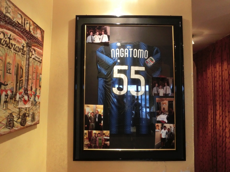 ではメトロへと戻ろう。ふたたび同じ長い道を歩くのだが、いかにもこれからスタジアムツアーに行きます、といった感じの人たちと何度もすれ違う。駅に到着し、ここからはCadorna駅経由でLanza駅へ(3E)。お昼ごはんの時間なのだが、目的地は長友が行きつけらしいNew Art Cafe。ドゥオモまでそんなに離れていないので、このあとも動きやすい場所だ。お店に着くと、お昼時で結構にぎわっていた。席に案内され、さて何にしようかな。ちょっと野菜不足なのでミネストローネ、長友がよく頼むというからすみパスタ、そしてミラノに何度も来ていながらまだ食べたことのないミラノ風カツレツ、こんなところで。お店の人もよくわかっているのか、カツレツはシェア?と聞いてくるのでシェア、と答えました。しばらくして、スープとパスタが登場。まずはミネストローネ、野菜がたっぷりでおいしい。ひとり一つでもいいくらいの、普段も食べているようなたっぷり野菜のスープ。おいしくいただきました。からすみパスタはアルデンテの麺にからすみが適度に絡まっていて、ちょうどいい味わい。最初の一品として、ちょうどいい感じです。ちなみに日本語メニューは見なかったが、最初この「からすみ」はなぜか「いかすみ」と書かれていたらしく、それを長友が指摘してなおしたとか、そんな噂があるのです。続いて登場したのはミラノ風カツレツ、薄いカツの上にはトマトとルッコラ。肉は薄いが衣もうっすらついているだけなので、肉の味がしっかりと味わえて衣も香ばしく、なかなかおいしいです。トマトとルッコラも合わせて食べると、なおいい感じですね。欲をいえばもう少し肉が厚めがいいので、どちらかといえばドイツのシュニッツェルの方が好みではあるが、これも十分おいしくいただきました。量としてはこれで丁度いい感じ、食後にエスプレッソをいただき、ごちそうさまでした(58E)。壁に飾られていた長友のサイン入りユニフォームを写真に収め、お店を出る。