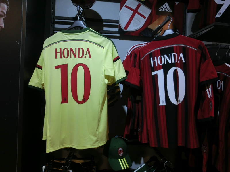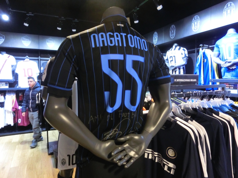 ドゥオモの裏側にサッカーショップがあるので行ってみる。ここは特定のチームというよりも、セリエAを中心にいろんなサッカーグッズを取り扱っているようだ。そんな中でもミランとインテルの商品は取り扱いが多いようで、ここにさっきのお店にはなかったインテルバージョンのくまのぬいぐるみがありました。これでセットになるので、もちろんゲットしましょう(11E)。これでここに来た甲斐があるというものです。本田に長友のユニフォームも、ちゃんとマネキンが来ていて目立つところにあり、うれしいですね。