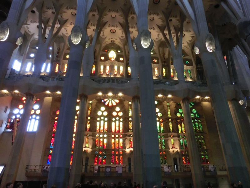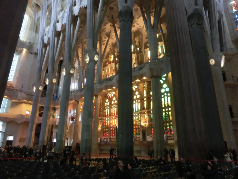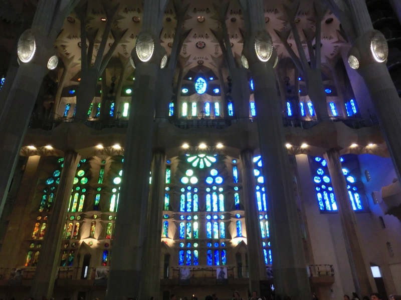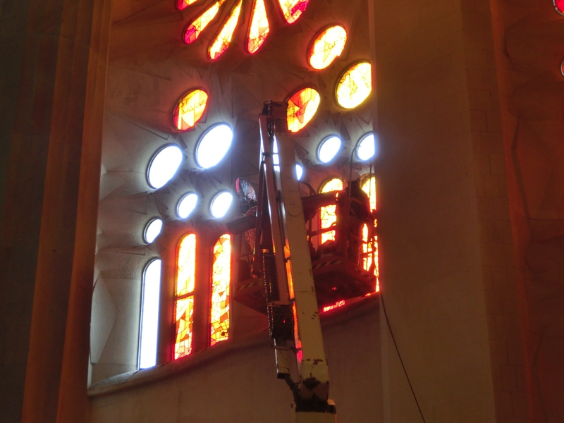 では中に入りますか。前回はまだまだ工事中で教会内は狭い順路に沿って見るしかなかったが、今回は・・・これはすばらしい。森をイメージしたとされる巨大な空間ができていて、ステンドグラスから光がさしている。なんとも神々しい空間だ。左右のステンドグラスは東側が青や緑が主な色で、西側は赤や黄色が主な色。どちらも美しい。よく見ると西側のステンドグラスはまだ工事中のところがあり、まさにクレーン車に乗って作業中。見ていると、実際にステンドグラスを装着する場面に遭遇しました。これで昨日とは明らかに見た目が違うわけで、こんな風に少しずつ出来上がっていくんだね。おそらく正面の入り口になるだろうという場所はまだステンドグラスが入っていない。ここ全体に入ると本当にきれいだろうな。完成予定は2026年、今からそのときが楽しみだ。地下の礼拝堂も上からのぞけるようになっており、教会内を見回っているといつの間にか時間が経つ。