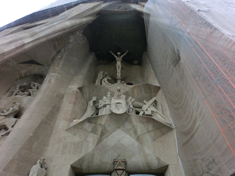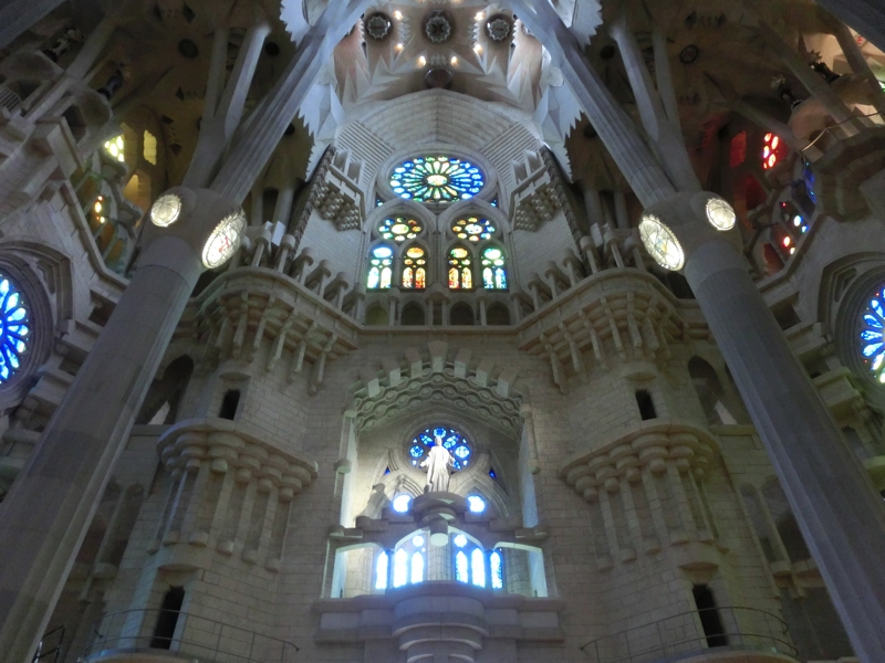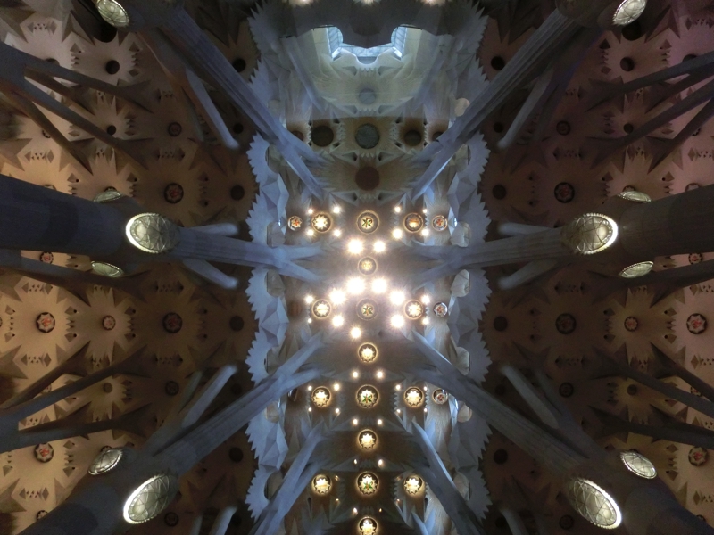 入り口と反対側をでると、「受難のファサード」を見上げることができる。こちらはまだ石の色も新しく、工事の足場があるなどまだ建設中。これはいつ頃できるのかな。教会内に戻り、天井を見上げてみる。左右対象のバランスがとても美しい。