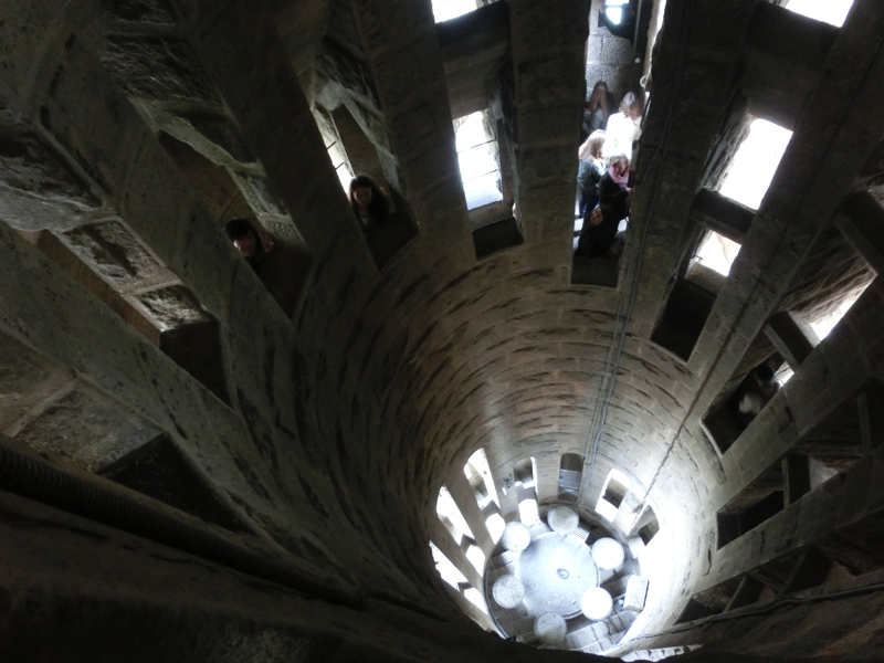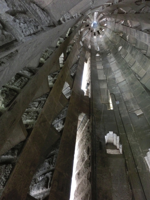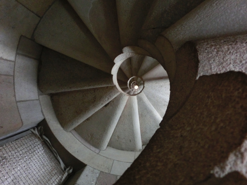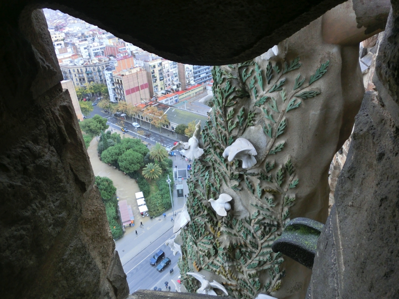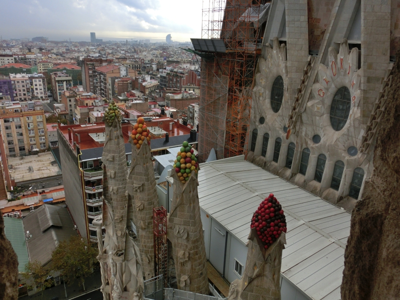 次はエレベーターで塔の上に行くのだが、これも事前予約制。15分単位の細かい設定で、それより早くても遅くても乗れないという噂。我々はちょうどその時間に行ったので問題なく乗れたけれど、どうやら早めにきた人はやっぱり乗れないようで、上がった先が狭いのできっちりと制限しているのだろう。生誕のファサード側のエレベーターで上まで行くと、丁度塔をわたる通路のところにでる。こんなタイミングで急に雨が降ってきたのだが、めげずにまずはこの通路からの写真を撮ろう。少し霧に煙ったようなバルセロナの街が見渡せて、すばらしい景色だ。ここからは、塔を螺旋階段のように少しずつおりていく。その途中で、いろんなアングルから市街地も見えるしサグラダファミリアの他の塔も見えるし、さらには工事現場も見ることができる。そうした景色を楽しみながら少しずつおりていると、今度は明るい陽がさしてきた。そうなるとまた景色の雰囲気もかわり、遠くの海がきらきらと光っているのが見える。いい景色だな。工事を行っているあたりでは屋根の上にプレハブができていて、ここでたくさんの人が工事に携わってるんだろう。真ん中にできる最も高い塔はまだまだこれからなので、完成が楽しみだな。じっくりと景色を見ながら、もうすぐゴールかな、最後はカタツムリをイメージした形が真ん中に見える螺旋階段をおり、鉄格子の扉を開けると教会内に戻ってきました。すばらしい景色を堪能した。