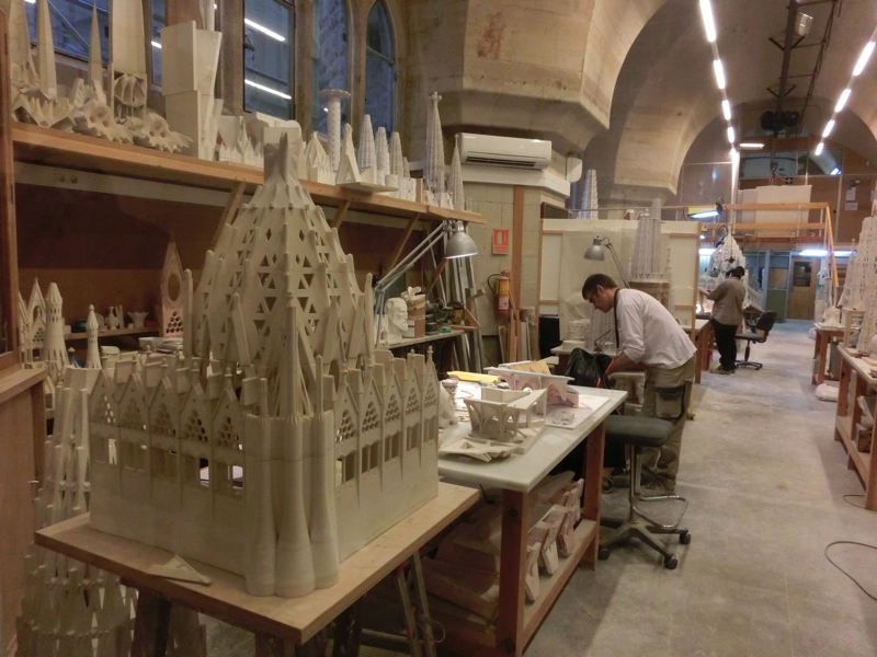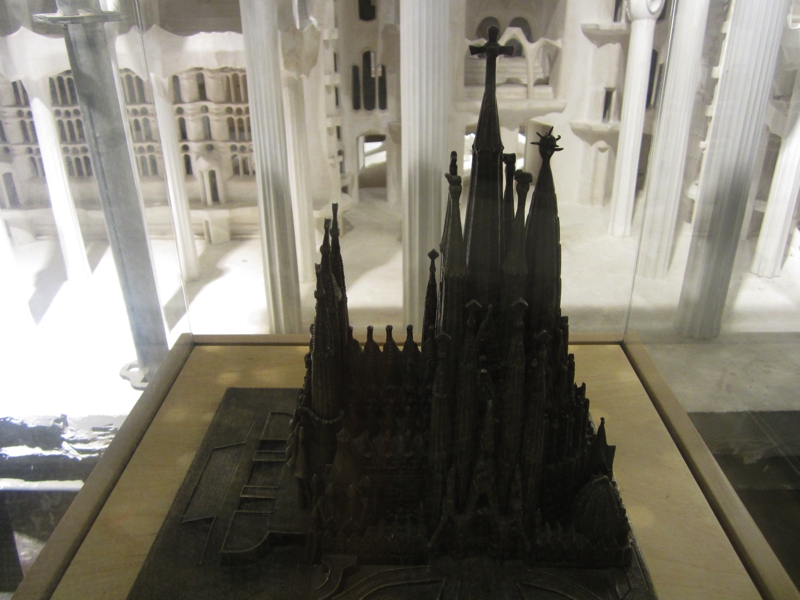 このあとは教会の地下部分にある展示を見る。このさらに地下の聖堂にはガウディの墓があるらしい。少しだけだが、ガラス越しに見えるようになっていました。他にも建築開始当時やローマ法王が訪れた時の写真があったり、設計図の一部が展示されているのが面白い。工房も見えるようになっていて、細かい部品などを作っている様子がわかる。このあとはショップに入る。特に買うものはないので、出ましょうか。そうしてあっという間に2時間以上も時間が経っていました。