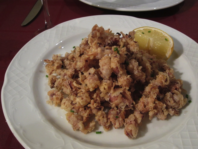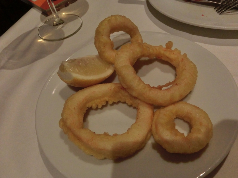 さて、晩ごはんに行こう。以前も行ったことのあるXATIVAというお店だが、なんとなくもっとサグラダファミリアに近い場所を想像していた。でも意外と離れていたのね。中に入ると、あまりお客さんはいない。ちょっと中心からは外れているので、こういうタイミングもあるだろうな。さて、何にしようか。ここではアンダルシア風イカフライと、パエジャとリゾットにしよう。cavaのハーフで喉を潤し、まず登場したのがイカフライ。ベイビーと書いてあったのでどんなイカかと思ったら、本当に小さなイカのフライだ。