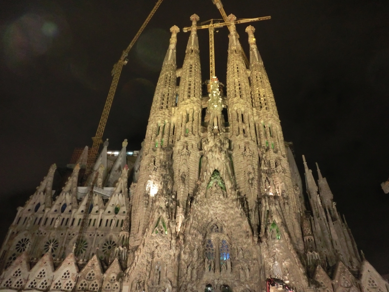 少し眠った後、20時すぎに目覚めた。もう雨はやんだし、ベランダから見る路地はライトアップが美しい。再びサグラダファミリアへ向かう。朝と同じくuniversitaから地下鉄に乗り、サグラダファミリアで下車(4.3E)。地上に上がると、ライトアップされたサグラダファミリアがそびえ立っていた。昼とは違った雰囲気で、また美しい。中にお客さんはいないようだが、灯りがついているようで工事は行われているのかな。夜の闇の中、ステンドグラスが光を受けてぼんやりと輝いている。今日工事していたあたりは、小さなステンドグラスもすべて取り付けが完了したようだ。毎日一歩ずつ、完成に近づいていくんだね。人も少なく、いい雰囲気だ。このサグラダファミリアはここで100年にもわたってこのバルセロナの街を見守っていたわけで、本当に完成が待ち遠しい。しばしこの景色に見とれながら、少しずつ離れて行く。