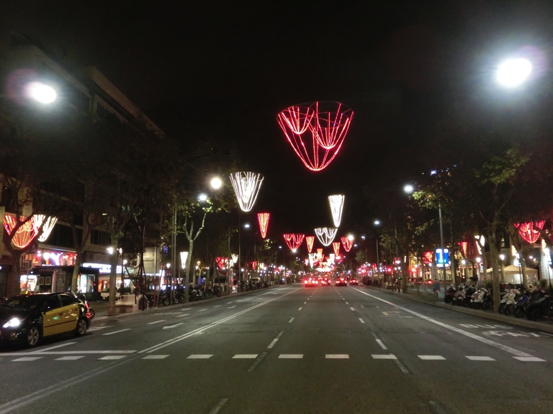 満腹なので、散歩しながら帰る。このあたりの道もイルミネーションが飾られていて、きれいだな。しばらく歩くと大きな通りに出てきた。ここからまっすぐ行けばカタルーニャ広場なのだが、この近くにあるのがカサ・バトリョ。バルセロナに多数あるガウディ作品の一つだ。ライトアップされていて、独特のデザインが夜の中に浮かび上がっていて、なんともいえない雰囲気です。有名なカサミラも少し歩いたところにあるのだが、逆方向なのでまあいいか。さあ、散歩を続けよう。寒すぎず、ちょうど歩くにはいい感じだ。いろんなイルミネーションを見ながら、昨日見たクリスマスツリーのところもまでやってきたぞ。