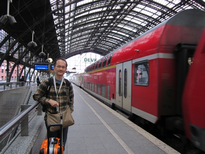早速乗り込み空いている席に着くと、そこは予約席。あら、そうか。隣の車両に移るとコンパートメント形式で、いくつか空き席はありそうなのでそこへ座りますか。ルクセンブルグからきたこの電車は、ドイツ南部のエムデンまで向かうようだ。途中、デュッセルドルフで乗ってきた団体は缶のビール樽で飲む気満々。デュイスブルグからのってきた団体は、タッパにチーズやソーセージなどが満載。どこも旅行は同じなんだね。