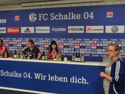 このあとは下に降り、スタジアム内のチャペルなどを見学。本当ならばここから選手のロッカーや通路、ベンチなどが見学できるはずが、明日の準備のために今日はできないとのこと。そうか、それは残念だなあ。清掃の方が通るときにピッチにつながる通路がちらっと見えたが、ここも炭坑をイメージした感じの通路になっていました。また次の機会があれば見たいものです。そのあとはさらに下に降りて、メディアセンターへ。記者会見が行われる場所で、明日に備えて記者の方々が原稿書き中。どんな試合になるかな。ここでは例によって、おきまりの記者会見席へ。マイクの回りにはスポンサーのフェルティンスビールが置かれ、まさに本番イメージ。ここで内田も記者会見をしたわけですね。こうして1時間ちょっとのスタジアムツアーが終了。お疲れ様でした。