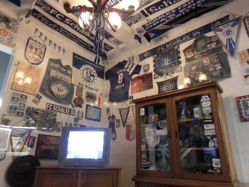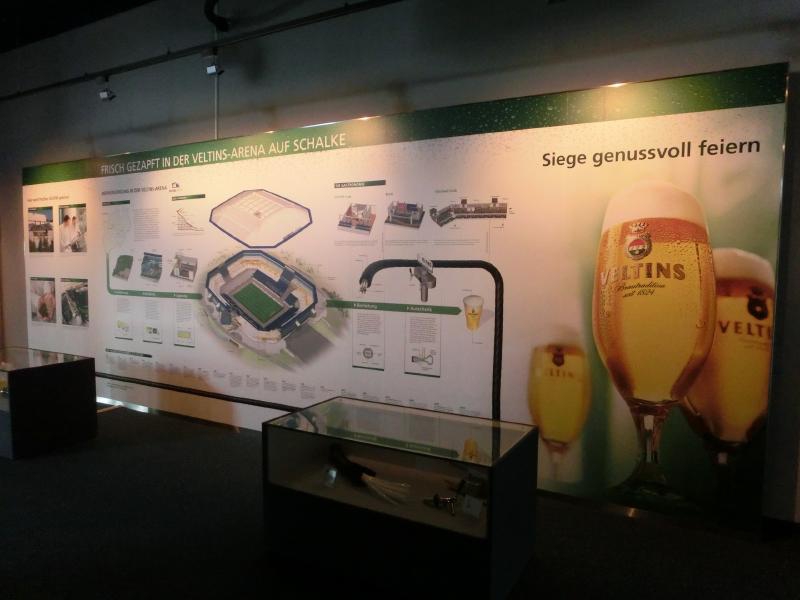 ミュージアムはシャルケが創立した110年前からの新聞記事や写真、栄光のトロフィーや数々の試合の記録など展示されていて、ドイツ語は分からないが見ているだけで面白い。ブンデスリーガを制覇したこともある一方で2部降格もあり、いろいろな苦難もあったようだね。ここ数年の展示はないので残念ながらこの中で内田の姿を見ることはできなかったが、何年かたって新たな展示がされるときにはここに紹介されるような選手になってほしいものです。シャルケファンの部屋をイメージした小さな部屋があり、壁全面にシャルケグッズが飾られていました。実際にこんな人もいるんだろうな。奥まで行くと、スタジアム内に張り巡らされているフェルティンスの生ビール管についての説明されている。明日は飲むぞ~ざっと一通り見たので、受付近くでちょっと休憩。飛行機でもらったどら焼きで栄養補給だ。