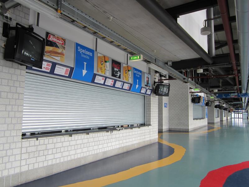 続いてスタジアム内に入る。がらんとしたところだが、ここが明日はいっぱいになるのだろう。ショップがあるので、ビールやソーセージの値段はチェックしておきましょう。この天井にはたくさんの管が走っているのだが、黒い管はビールが通る管。たくさんあるショップでどこでもおいしい生ビールをいただけるのは、この管のおかげです。壁には何の変哲もない扉があり、その中には巨大な生ビールのタンクがありました。とにかくビール、ドイツらしいです。