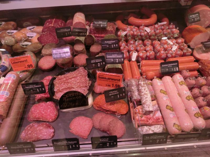 ふう、すっきりしたぞ。では街歩きをしましょう。とりあえずいろいろとスーパーを見たいので、駅の近くをぶらぶら歩いて適当に入って見る。しばらく歩いていると、さっき食べたソーセージ屋さんのすぐそばにスーパー発見。ここはよさそうだな。ソーセージ系が充実しているのが楽しいな。とりあえず目的のレバーペースト見つけたので、まずはゲットしましょう。