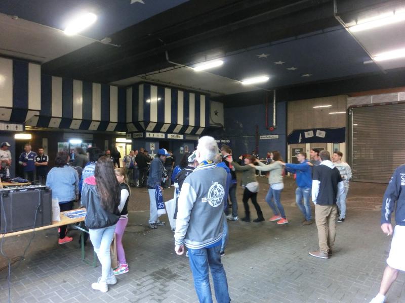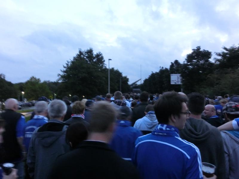 さて、応援スタイルが完成したところで行きますか。取りあえずゲート前に戻ると、さっきよりもたくさんの人たちがビールやソーセージを楽しんでいた。結構歩いて喉が渇いたので、やっぱりビールだね。屋台でVeltinsの生ビールをゲットし、試合前のにぎやかな雰囲気を楽しむ(7.8E)。よく見ると、青い中にぽつぽつと赤い人がいるのはバイエルンミュンヘン。でもやっぱりここはシャルケホームなので、ほとんどが青いシャルカーだね。でもバイエルンは野球でいうと巨人のような存在なのかな。ビールを飲み干したところで、そろそろ行きますか。ゲートを入ると、セキュリティチェックでは思った通りペットボトルの水が指摘されました。残りもそんなにないのでその場で飲むが、やっぱり持ち込みたいよね・・・でも仕方ない。