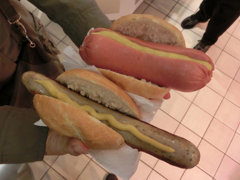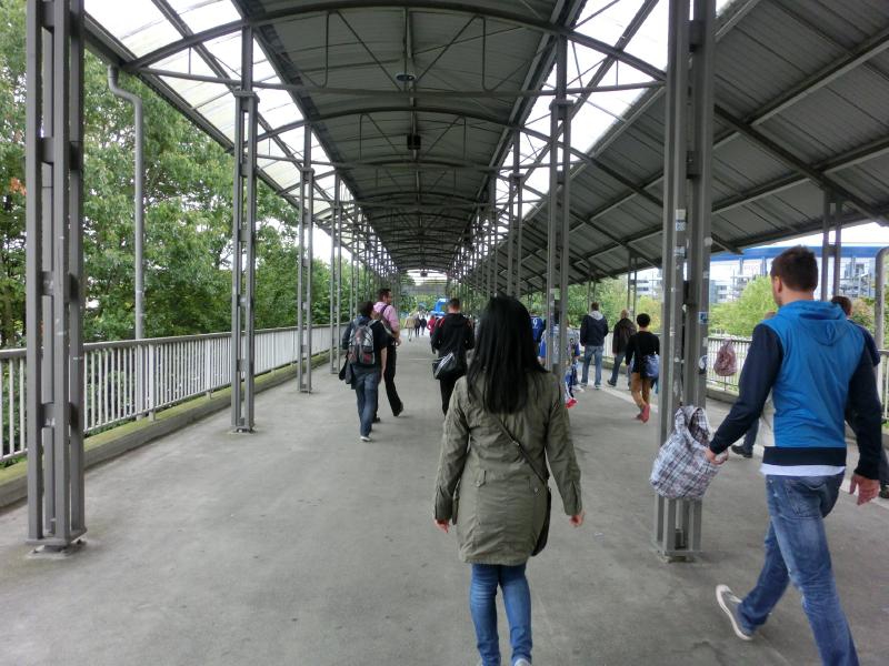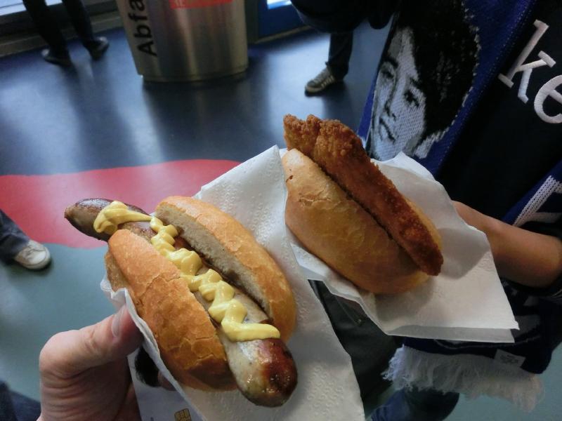 部屋にもどって荷物を置き、出かけましょうか。駅前にはさらにシャルケユニの人が増えていて、どんどんとにぎやかになっている。この雰囲気、いいですねえ。2時を回ったので、昼ごはんかな。昨日も行ったソーセージ屋さんに行こう。今日もにぎわっているが回転が速いのですぐに順番が回ってきた。日本ではありえない太いソーセージのと、基本的な焼きソーセージのをゲット。どちらもマスタードをつけて食べる。うまいねえ。ソーセージそのものもうまいが、なによりこのパンがうまい。歯ごたえがしっかりしているのと、香ばしい小麦の香り。実にうまいです。お昼ごはんとしてはこれで満足、そろそろ行きますか。昨日はこの駅付近では動いていなかったトラムだが、今日は無事に動いているようだ。よかった。駅はすでに人でいっぱいで、ちょうど来たトラムにたくさんの人が乗り込んでいる。試合の日は、観戦チケットを持って入ればトラムが無料になるのがうれしいサービス。ではスタジアムに向けて出発だ。
