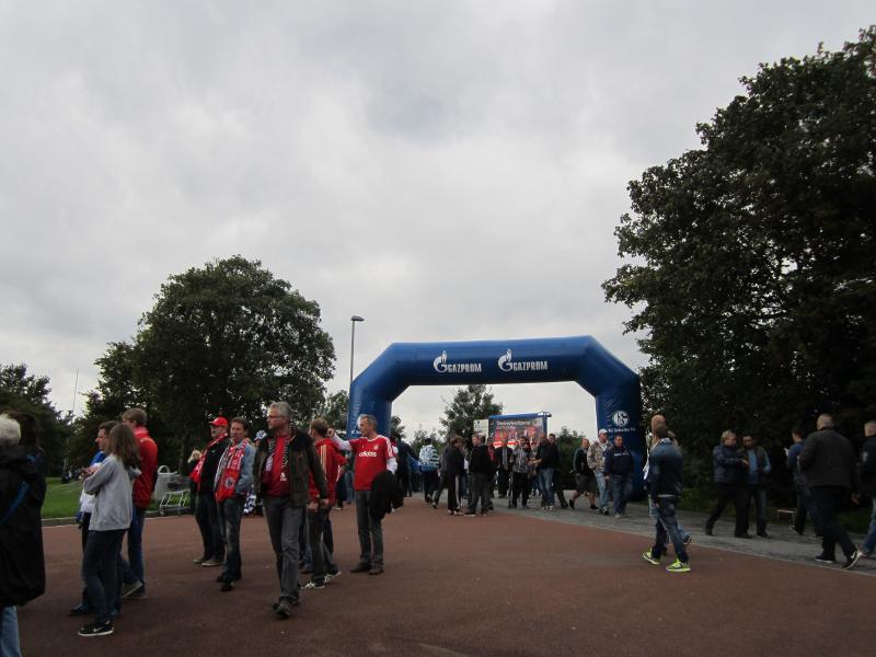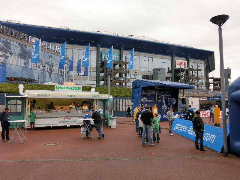 昨日はバスで通ったミュージックシアター駅や乗り換えたケネディープラーツ駅を過ぎ、スタジアムに向けて走る。途中の駅でたくさんのシャルカーの人が下りたので何事かと思っていたら、その近くにシャルケファンの集まる居酒屋があるようで、店の前にテーブルを出してビールを飲んでいるのが見えた。なるほど、そういう楽しみ方もあるんだね。ということで、ユニフォームを来ているのに途中で降りる人が意外に多く、しばらくすると座ることができました。われわれは直接スタジアムでいいので、アレーナ駅で降りる。昨日はあんなに閑散としていたのに、今日はすでにたくさんの人がスタジアムに向かっているようだ。昨日は出ていなかった空気で膨らませるゲートも出ているぞ。スタジアムの前には、ソーセージやビールの屋台がでている。