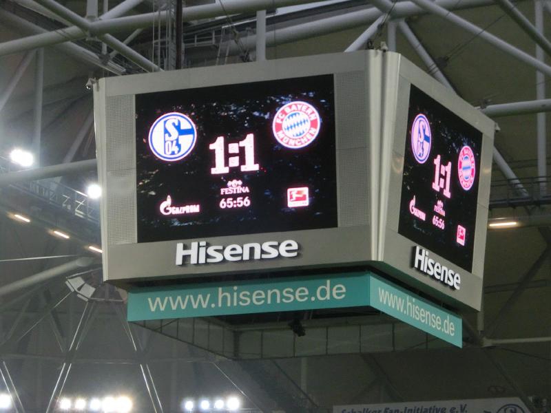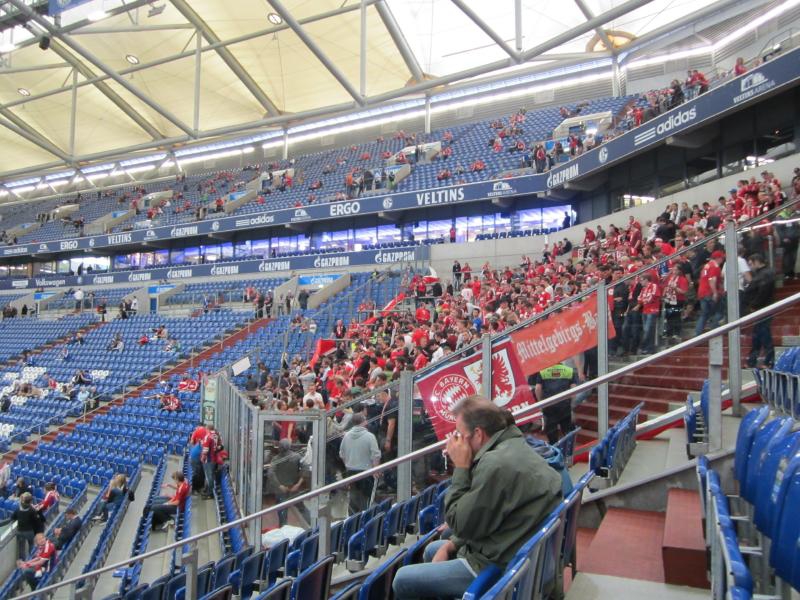 さあ、後半が始まる。後半はわれわれの席側にシャルケは攻めてくるし、ゴール前にはノイアーがいるし、しっかり楽しませてもらいましょう。途中の選手交代などがあり、後半17分に緩やかなフリーキックから、ゴール前で折り返したチュポモティングのシュートをシャビアロンソがクリアするも、そのボールがヘーヴェデスに当たってそのままゴール。リプレイを見るとハンドかどうか微妙なところで、ノイアーが審判に抗議をしていたが認められず、シャルケが追いついた。スタジアム全体が歓声に包まれている。そう、やっぱりホームチームのゴールが決まるとこんな雰囲気を楽しむことができるんだね。そのゴールの直後、バイエルン側のサポーター席から何かがシャルケ側のサポーター席に飛んでいったが、おそらくドリンク入りのカップ。それはダメでしょ。こんなカップが飛んでいくようなら、やっぱりペットボトルは持ち込み禁止になるよね。
