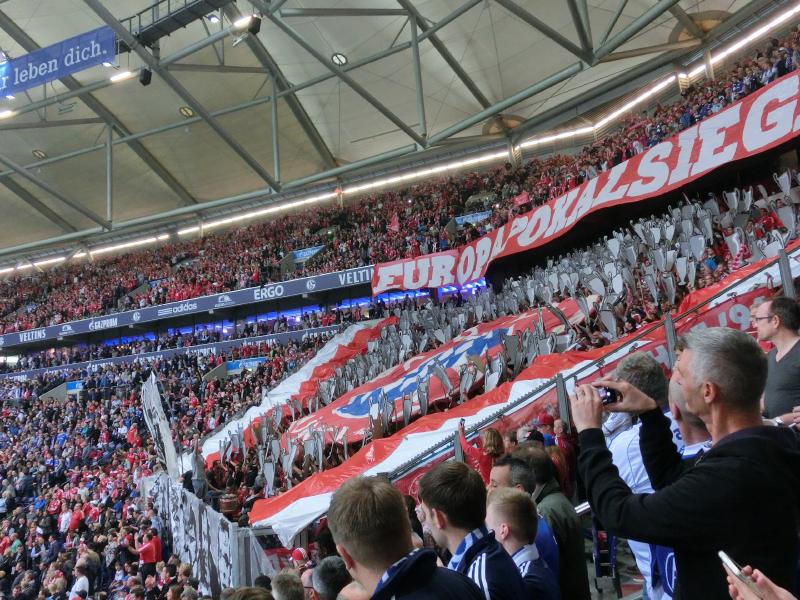 ウォーミングアップも終わり、そろそろ試合開始。歓声と共に、両チームの選手が入場してきました。するとシャルケ側のサポーター席では、巨大な応援旗が3つも掲げられた。過去の映像をモチーフにしているのか、モノクロの写真のような応援旗で、その意味はよく分からないが熱狂的な応援が行われている。あとみんながダンボールで作ったようなサッカーボールを掲げていました。一方、すぐ横のバイエルンサポーター席では、みんながダンボールで作ったようなトロフィーを掲げている。それぞれチームカラーだなあ。お互いの応援合戦が終わり、選手が入場し、いよいよキックオフ。初めてのブンデスリーガの試合観戦だ。