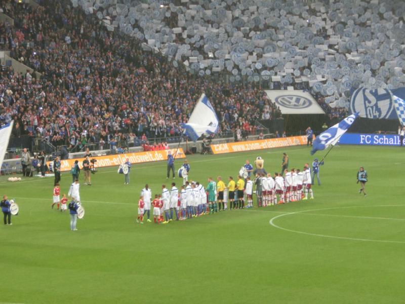 何はともあれ、とにかくシャルケにとっては相手がバイエルンなので引き分けでも十分なので、悪くてもこのまま終わりたいところ。それぞれチャンスは訪れるものの結局この後はゴールはなく、1-1で終了。無事に引き分けで終了できたとのことで、スタジアムは喜びの歓声に包まれた。バイエルン側はやっぱり勝ちたい試合だったようで、静かに撤収の準備をしていました。この試合、観客は61973人。すごい数だなあ。サッカー熱の高い地域だとは聞いていたが、想像以上に熱狂的なファンがたくさんいるんだね。シャルケの選手たちはピッチを一周し、観客の歓声に応えている。エルヴィン君も一緒にね。
