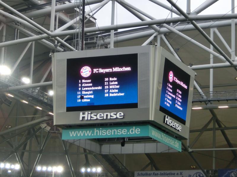 観客席に戻ると、ピッチでは試合前のウォーミングアップが始まっていた。青い中に、やっぱり内田は見あたらないなあ・・・残念だが仕方がない。手前にはバイエルンの選手たちがいるが、ミュラーにラーム、ゲッツェの姿が見える。いつの間にか、シャビアロンソもバイエルンなんだね。リベリにロッベンは怪我らしく、残念だな。でもキーパーにはノイアーもいるし、本当にワールドクラスの選手が揃っている。そのバイエルン相手に、シャルケがどこまで戦えるか。特に開幕初戦を落としているので、この試合は重要だ。しばらくすると、今日の先発メンバー発表が行われた。バイエルン側はポーランド代表レヴァンドフスキ、スイス代表シャキリ、ドイツ代表ボアテングなども出場する錚々たるメンバー。対するシャルケは、内田が出ないと正直なところ誰もわからない・・・今回はバイエルンが相手ということでチケット確保が大変だったが、結果としては知っている選手がたくさんいてよかったかもね。
