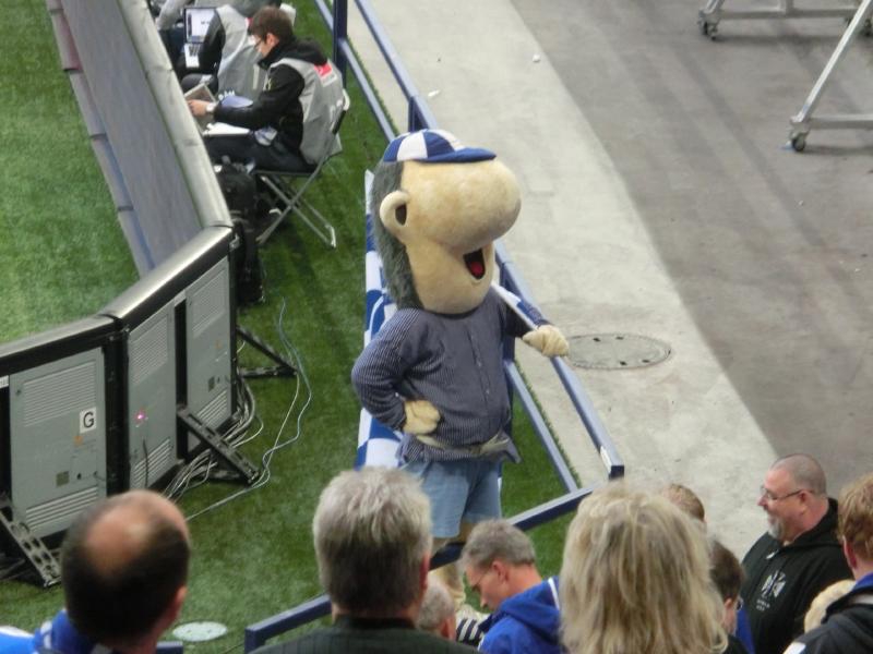 そしてあっという間に前半が終了。早いなあ。ハーフタイムにはシャルケのゆるキャラが愛嬌を振りまいている。彼はエルヴィン君と言うらしく、炭鉱の街と言うことでなんと炭鉱夫らしい。てっきりロバかと思ったが・・・そして永遠の17歳らしい。17歳の炭鉱夫って、なぜそんな設定なんだろうなあ。