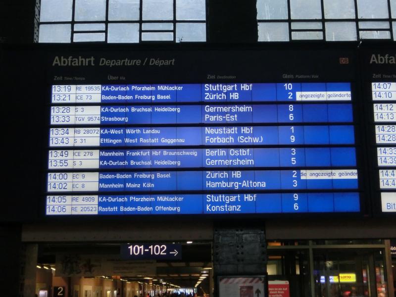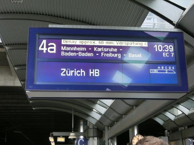 まだまだ時間がある。昼ごはんのサンドイッチでも買いだそうかと思って何軒かお店を見てみたが、今ひとつピンと来ないなあ。ちょっと大きめのキオスクに入ると、雑誌コーナーのところに岡崎の等身大パネルがあり、マインツのシーズンチケットの広告らしい。こういう広告になるということは、マインツの顔になっているということだよね。昨日は残念だったが、もっと点を入れてほしいな。一通りお店も見たし、ちょっと疲れてきたのでホームで待ちますか。もう本来の出発時間は過ぎているのだが、遅れ時間は相変わらず50分と出ている。そしてしばらくして見てみると、遅れ時間が60分に変わっていました。うーん、早く来てくれ~~・・・11時40分を少し過ぎた頃、ようやく目的の電車が到着。結局約65分遅れというわけですね。早速乗り込み、座席に着く。ふう、ほっと一息だ。電車はすぐに出発し、ようやく落ち着けるぞ。出発してしばらくして、係の人が回ってきた。検札かな、と思っていたら、なにやら申込書のような用紙を渡された。早口の説明を聞き取った限りでは、電車が遅れたのでどうやら特急料金の払い戻しがあるらしい。チケットを購入したクレジットカードに料金が戻るように聞こえたのだが、あとで用紙をよく見るとクレジットカード番号を書く欄はなく、ドイツ内の銀行口座を書く欄しかない。となるとどうしようもないよね・・・電車はその後はスムーズに走り、乗り換えの駅・カールズルーエに到着した。