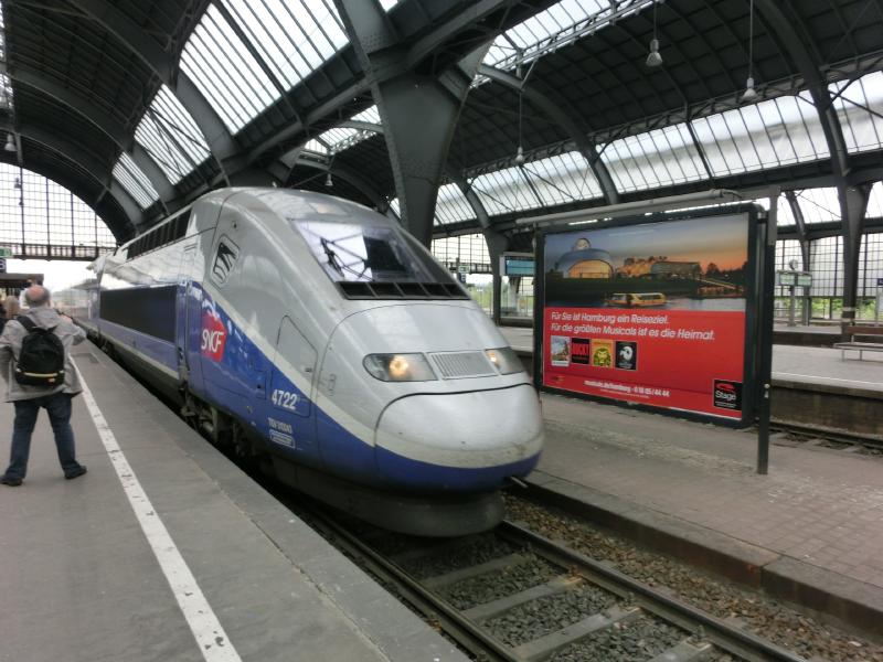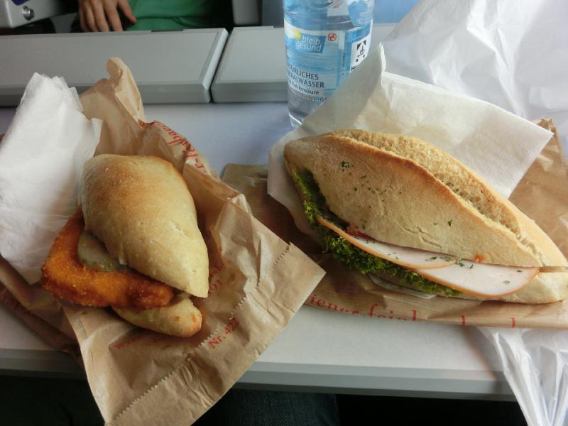 このタイプは初体験だが、タッチパネルで分かり易い。言語を選び、行き先を選び、列車を選び、シートタイプを選び、人数を選ぶ。新幹線の自動販売機と同じことかな。最後にクレジットカードを入れ、無事に購入完了(108.4E)。よし、まだ10分あるぞ。駅ナカのパン屋さんでサンドイッチを2種類買うには時間は十分(5.75E)。ホームに上がると、ちょうど電車が来るところ。シュツットガルトからストラスブール経由でパリへ向かうTGVは、2階建てでほぼ満席。われわれは1階席で、荷物をどう収めるかにちょっと苦労したが、うまく座席の隙間に入れられました。これでようやく落ち着ける。次の乗り換え駅、ストラスブールまでは40分もないので、ちょうど新大阪~岡山間くらいかな。さっき買ったサンドイッチを頂きましょう。ハム入りのとシュニッツェル入りので、いつもながらおいしいです。こうしたドイツ風のサンドイッチも、これで食べ納めかな。