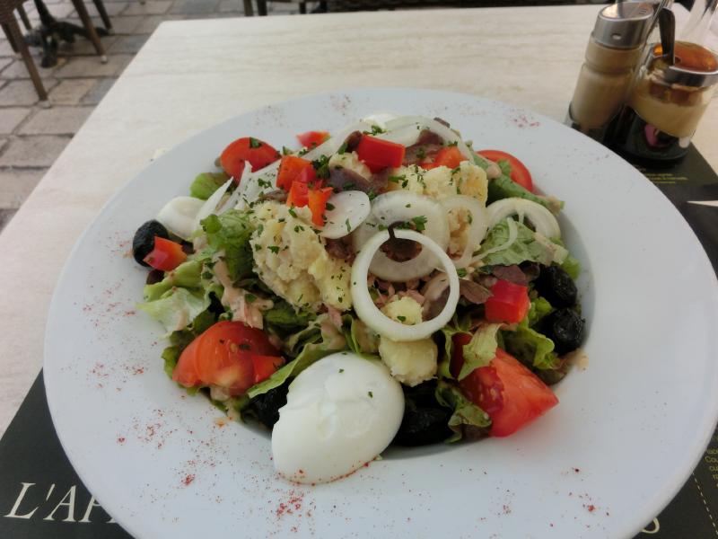 今までのドイツビールから、ベルギービールに変わったぞ。黄金色のStella Artoisと琥珀色のLeffe、どちらも飲みやすくておいしいです。そんなにお腹が減っているわけではないが、久しぶりに生野菜をしっかり食べたい。というわけで、サラダニソワーズをいただく。サラダとはいえ、ゆで卵やアンチョビが入っているのでちゃんと食べ応えがあり、黒オリーブがビールにあう。いいですね。もう一品はこの地方の名物、キッシュドロレーヌだ。正直あまり得意な料理ではないが、名物なので頂きましょう。玉ねぎやベーコンが入っていて、まあ想像通りかな。広場の景色を見ながら、ゆったりとした時間を楽しみましょう。デザートにはチーズ。思ったよりはかなりフレッシュなチーズで、さっぱりしておいしいぞ。フランスでの最初の食事、満足しました(40E)。