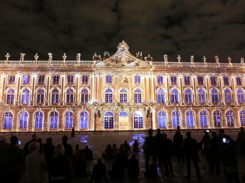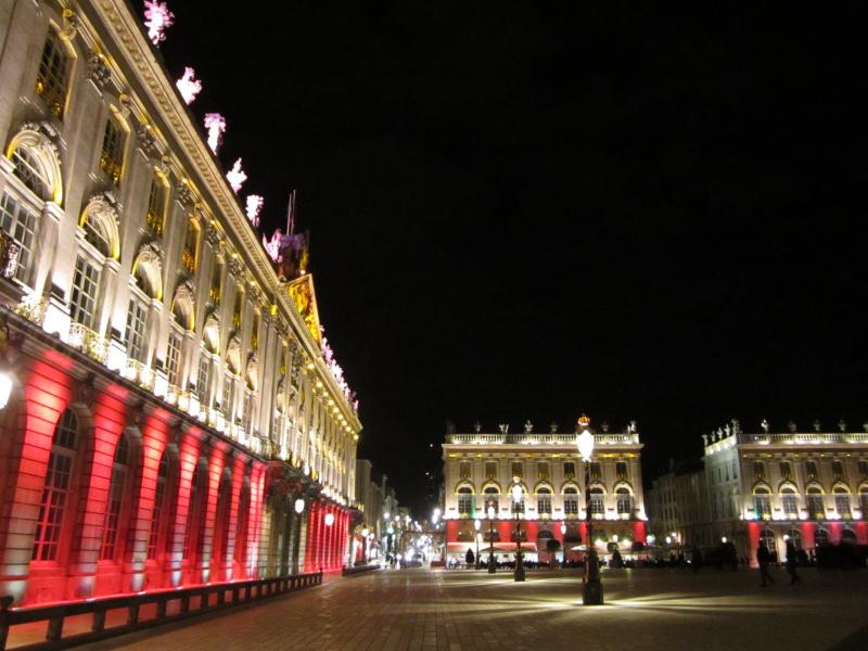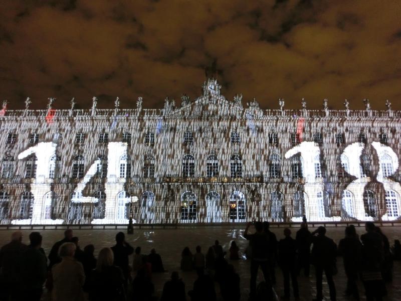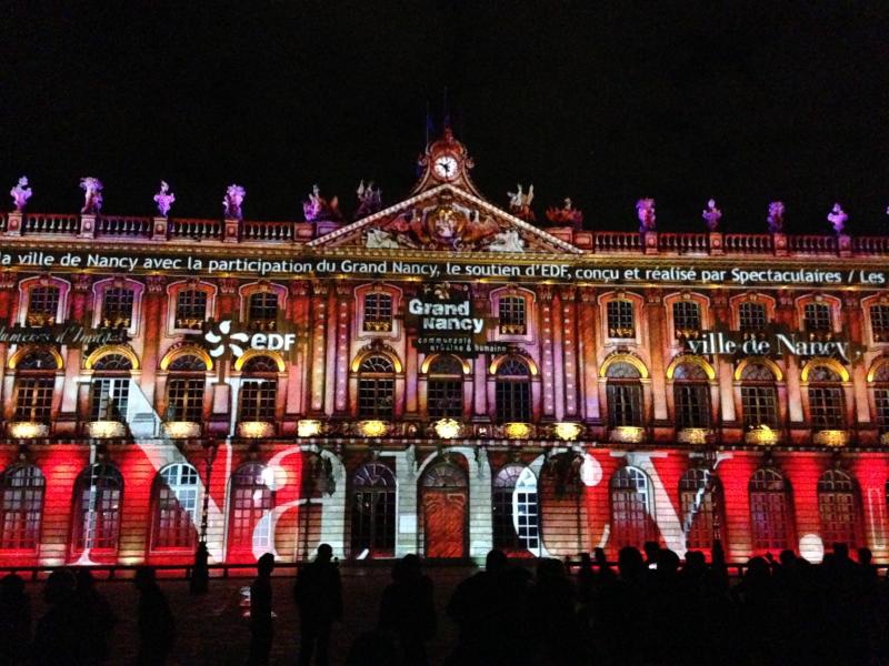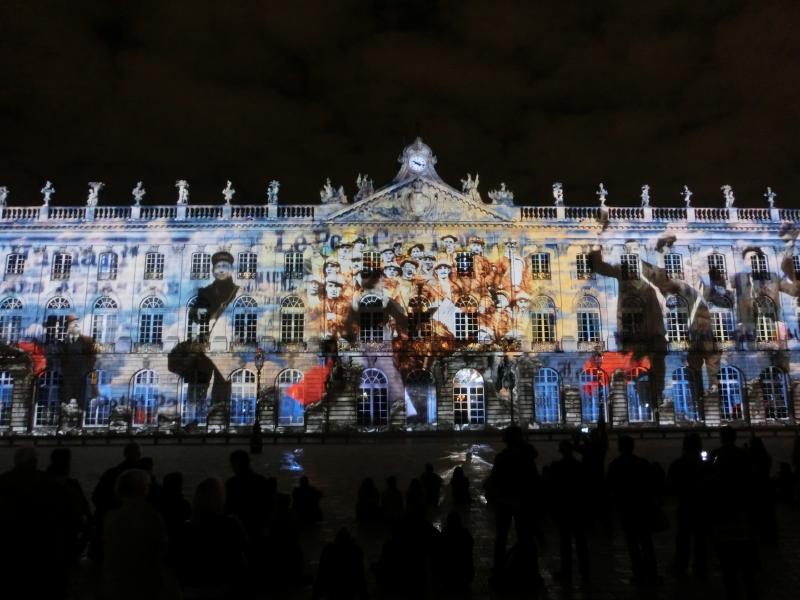 スタニスラス広場に着くと、広場に面した建物がライトアップされている。下半分がピンク色できれいだな。まもなく始まる音と光のショーに備え、たくさんの人が広場に集まっている。市庁舎がよく見えるよう、スタニスラス公の像のすぐ前に陣取り、準備完了。22時になり、しばらくするとライトアップがはっきりしてきて、音楽が始まった。そしてここからは音と光のショー。ナンシーの歴史を表しているようで、スタニスラス公や広場を設計したエマニュエル・エレがまず表示され、その後は市庁舎の建築の様子が表現される。あとはおそらくナンシーの著名人だったり戦争の頃の様子であったり、市庁舎の形状を利用したショーが次々と行われる。さまざまな色や効果で、見るものを飽きさせないような演出がすばらしい。