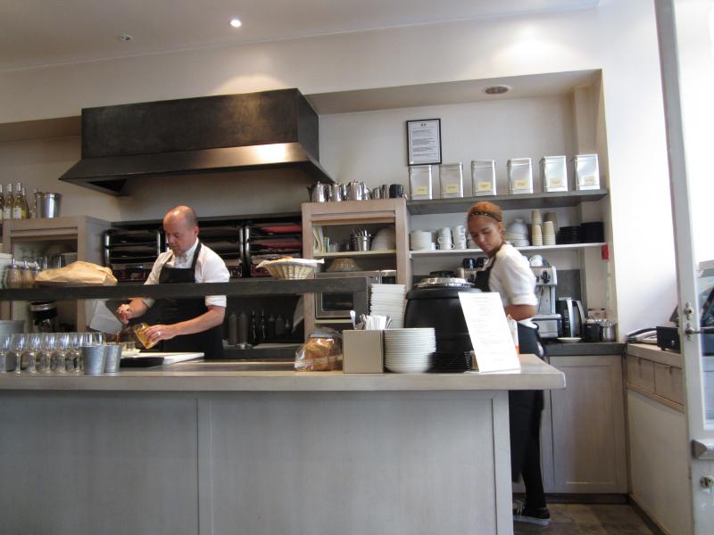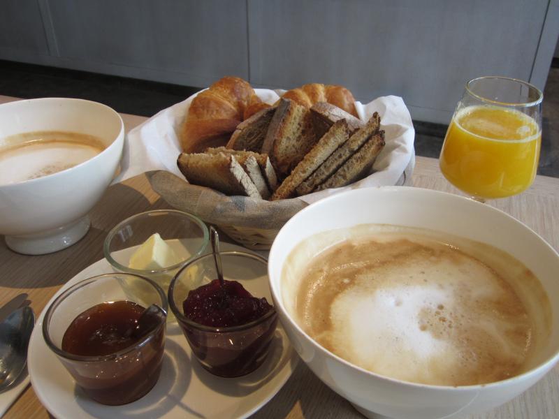 なんだか贅沢でちょっと申し訳ない気分だ。出来上がって運ばれてきたものは、まず目立つのは巨大なカフェオレ。こんなに飲めるのか?とも思うのだが、まずは搾りたてのオレンジジュース。これは間違いなくうまい。こういうジュースは日本ではなかなか飲めないのだが、果物は日本が高いのかな。そしてかごにいっぱいのパン。クロワッサンとともに入っているのは、お店名物の巨大な丸いパンを薄くスライスしたもので、カリッと焼かれている。これにバターとジャムをたっぷりとつけていただく。香ばしくておいしいです。合間に巨大なカフェオレをいただきながら、たくさんのパンをいただきました。頼みかたがよくわからなかったので朝ごはんセットを2人分にしたが、これだけ量があるなら1人分にしてもう1人は別のものを頼んでも良かったかな?でもそれならこのジュースはきっと飲めないだろうし。。。ごちそうさまでした(22E)。
