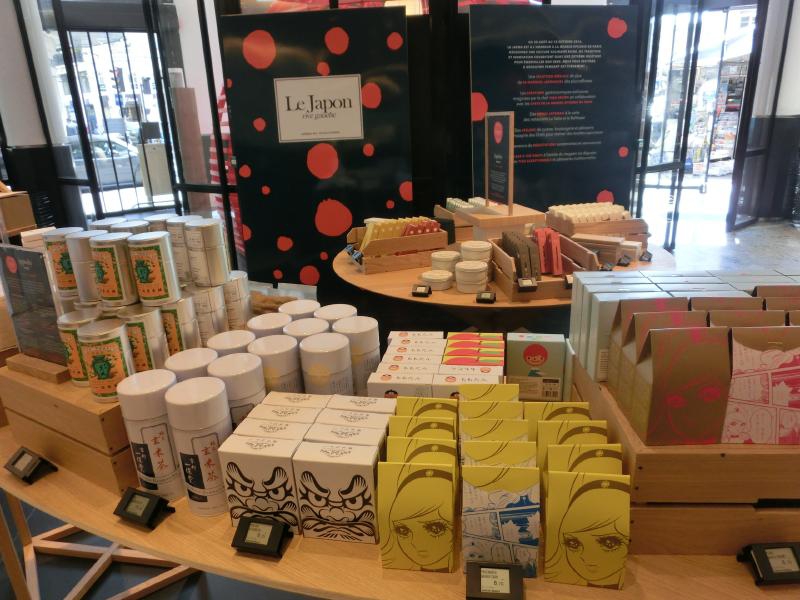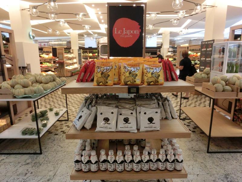 では再び街歩き。しばらく歩くと、Sevres Babylone駅のエリアに来た。そして昔からよく来ているデパート、ボンマルシェに到着だ。中に入ると、まず目につくのがJAPONの文字。たまたま日本フェアをやっているタイミングらしく、日本の米や酒、お菓子や調味料などがたくさんありました。さらに店内の様々なところに寿司やラーメンなど、日本の食を紹介している。日本ではあまり見かけないような商品も数多く並べられていて、これは面白いなあ。