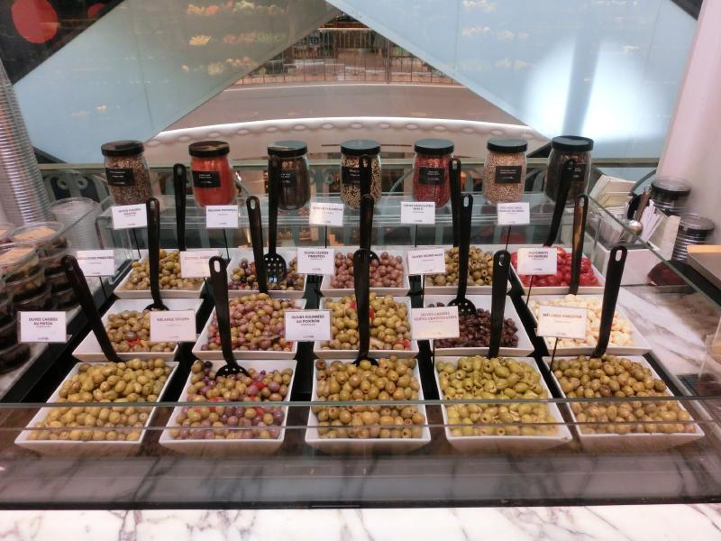 魚屋や肉屋、惣菜屋などそれぞれのお店ごとに軽く食べられる場所ができているようだ。なんとも魅力的ではないか。あとで何かいただくとして、食料品以外のフロアにも行ってみよう。2階より上にはキッチン用品や家具などが売られているのだが、ボンマルシェのエコバッグを買ったりしながらざっと見て回る(9E)。お茶屋があったのだが、いろんな言葉で「茶」を意味する文字が書かれた缶がちょっといい感じかな。日本語は「茶」ではなく丁寧に「お茶」と表記されているのが面白い。