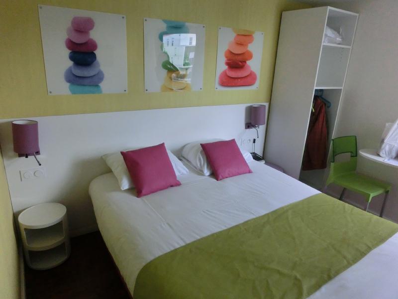 すれ違うRERは、結構落書きされているのが多いなあ。日本ではまずありえない状況ですね。途中いくつか駅に止まるが、駅周りの雰囲気はやっぱりパリ中心街とはちょっと異なり、アフリカ系やアラブ系の人が多いようだ。そしてサンドニに到着、まだ試合まで時間があるのでそれほどでもないが、駅前には人が集まってきている。あと何時間後には、ここに数万人の人が集まるわけですね。ではホテルへと向おう。ここも郊外の街らしく、アラブ系やトルコ系の人が多いのかそんな感じのお店の前を進み、今日のホテル、ibisに到着。ちょっと古い感じの建物だが、部屋はリニューアルされたようでカラフルだ。ふう、ここまでの移動でちょっと疲れた。まだ16時だし、キックオフは21時なので、しばらく休憩しましょう。