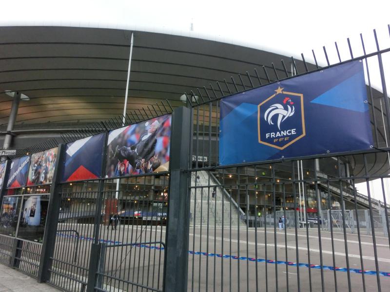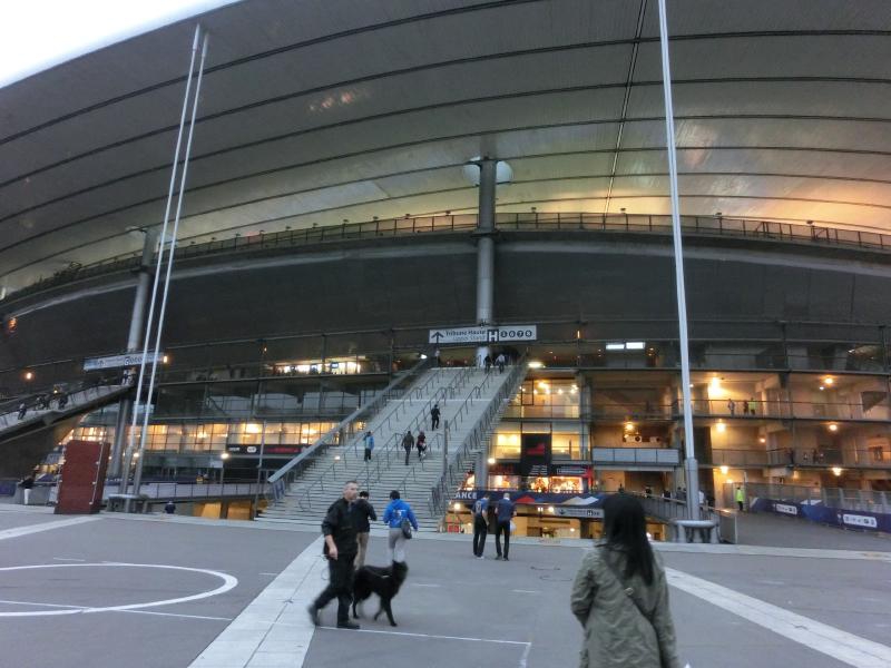 結構寝たかな。そろそろ行きましょう。ホテルを出て、スタジアムへと向かうとユニフォームを着ている人がずいぶん増えてきた。サンドニの駅に到着すると、駅前はフレンチブルーのユニフォームの人でいっぱいだ。ソーセージやフレンチフライの屋台が出ていて、人が集まっている。ざっと見ると、フレンチフライをフランスパンに挟んでサンドイッチを食べている人が結構いる。うーん、カロリーは取れるがほぼ炭水化物・・もうちょっとスタジアムに近づいてからでいいかな。人の流れに沿って歩いていくと、見えてきましたサンドニスタジアム。巨大で、圧倒される。ここで1998年のワールドカップが行われ、フランス対ブラジルの決勝戦が繰り広げられたかと思うとなんとも感動的だ。この辺りでは応援の声を上げている人も多く、試合にむけて盛り上がっているようだ。