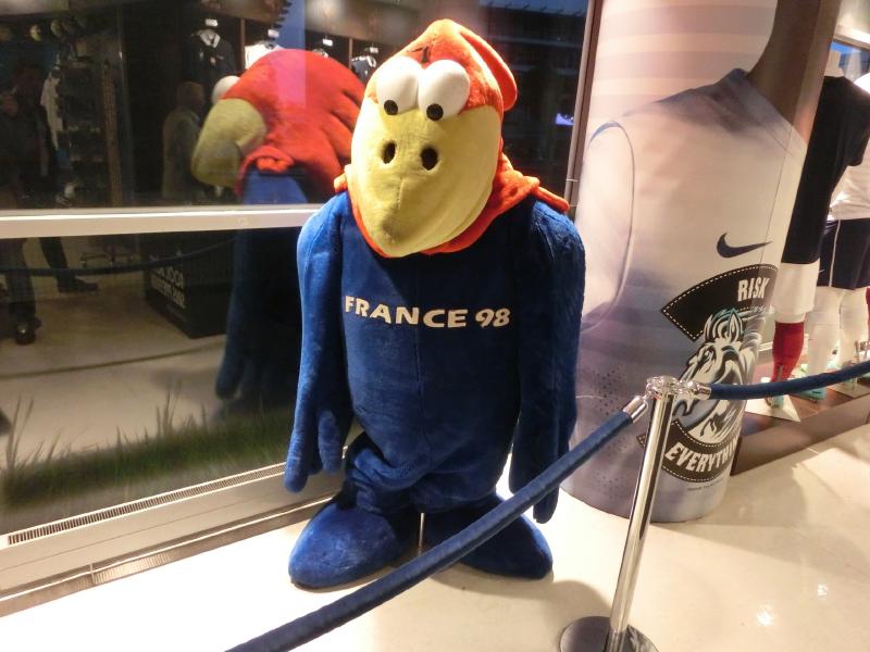 ではスタジアムに入りますか。セキュリティゲートを通ると、巨大なスタジアムが目の前に聳え立っている。でかいなあ。ゲートの近くにお土産やさんがあったので、まずはのぞいてみる。なにか記念になるものをということで、パリなのでエッフェル塔と、スタジアムなのでサッカーボールのフィギュアをゲット(10E)。まあ、他にあまりいいものもなかったかな。さあて、中に入ろう。がらんとした少し薄暗い通路を通り、ゲートを抜けるとそこには緑のピッチが広がっており、観客席では無数のフランス国旗がはためいていた。